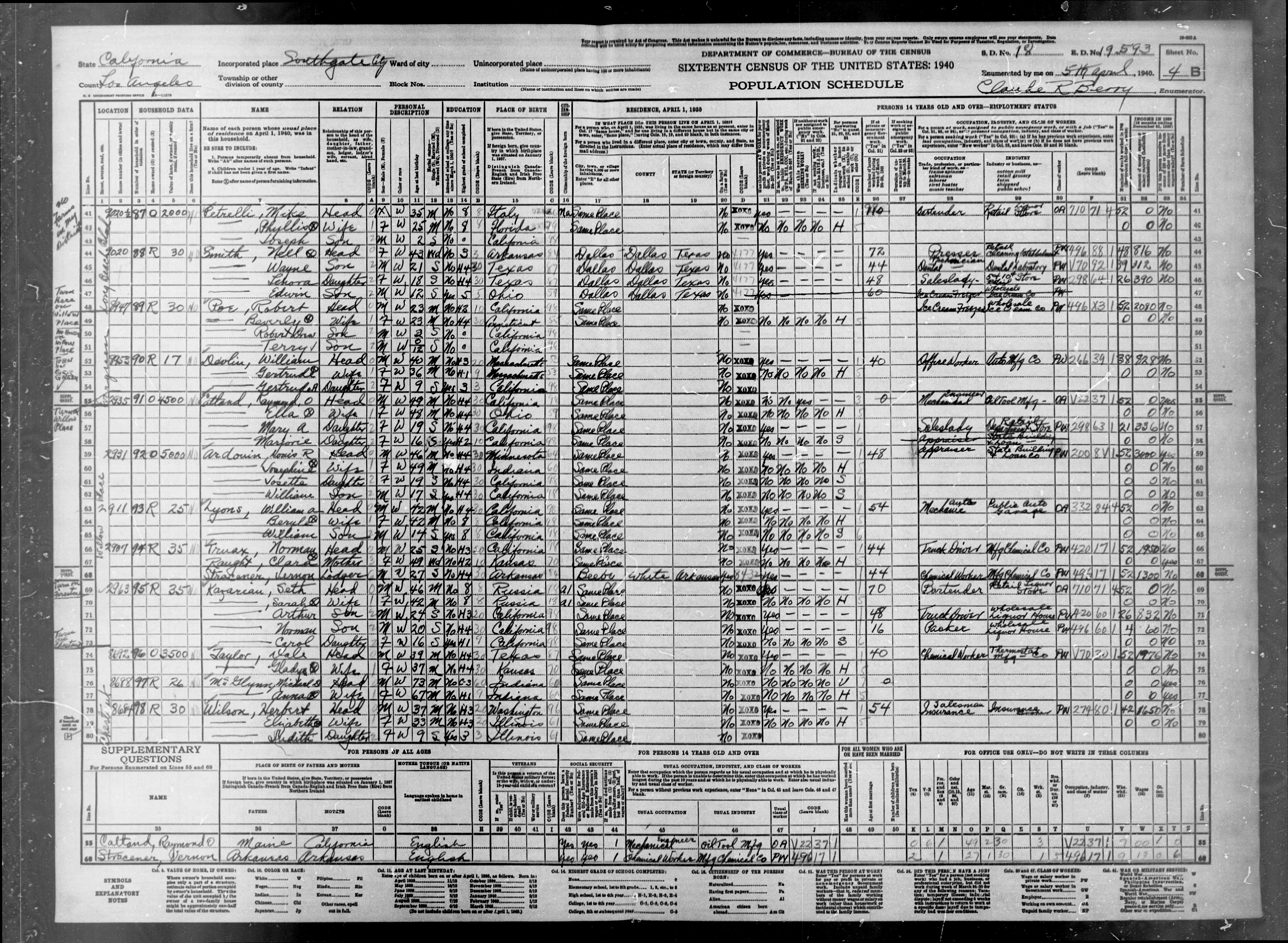 47. “United States Census,” 1940, CA, Los Angeles, South Gate, San Antonio Judicial Township, 4B, 18, 19-593, T627, 247, Bureau of the Census, US Dept. of Commerce, United States of America, April 5, 1940, Claude R Berry.