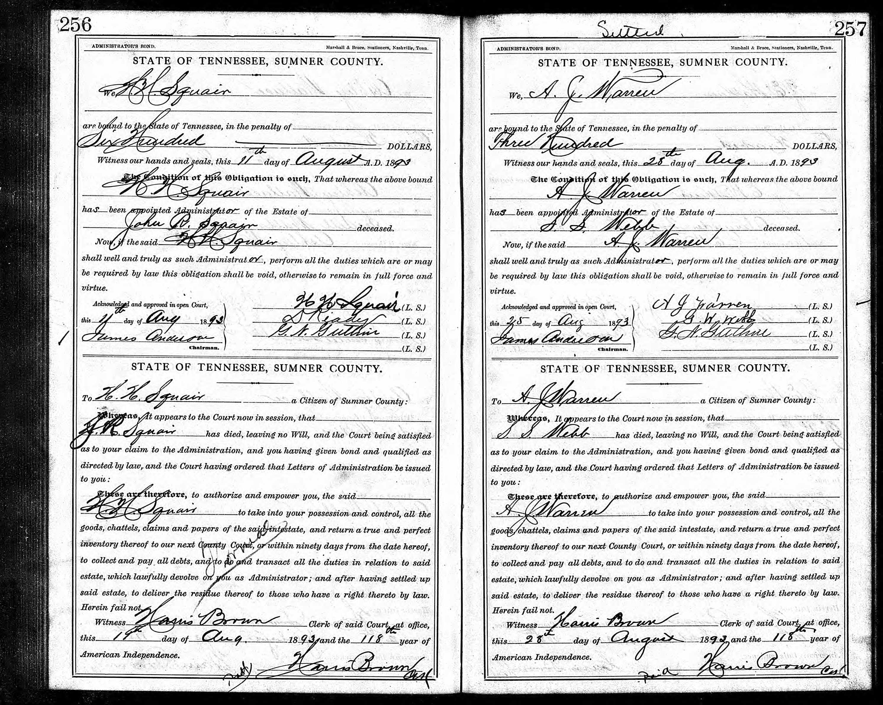 71. Florence Webb, “Tennessee, Wills and Probate Records, 1779-2008,” October 17, 1895, Executor Bond was established on April 3, 1893.