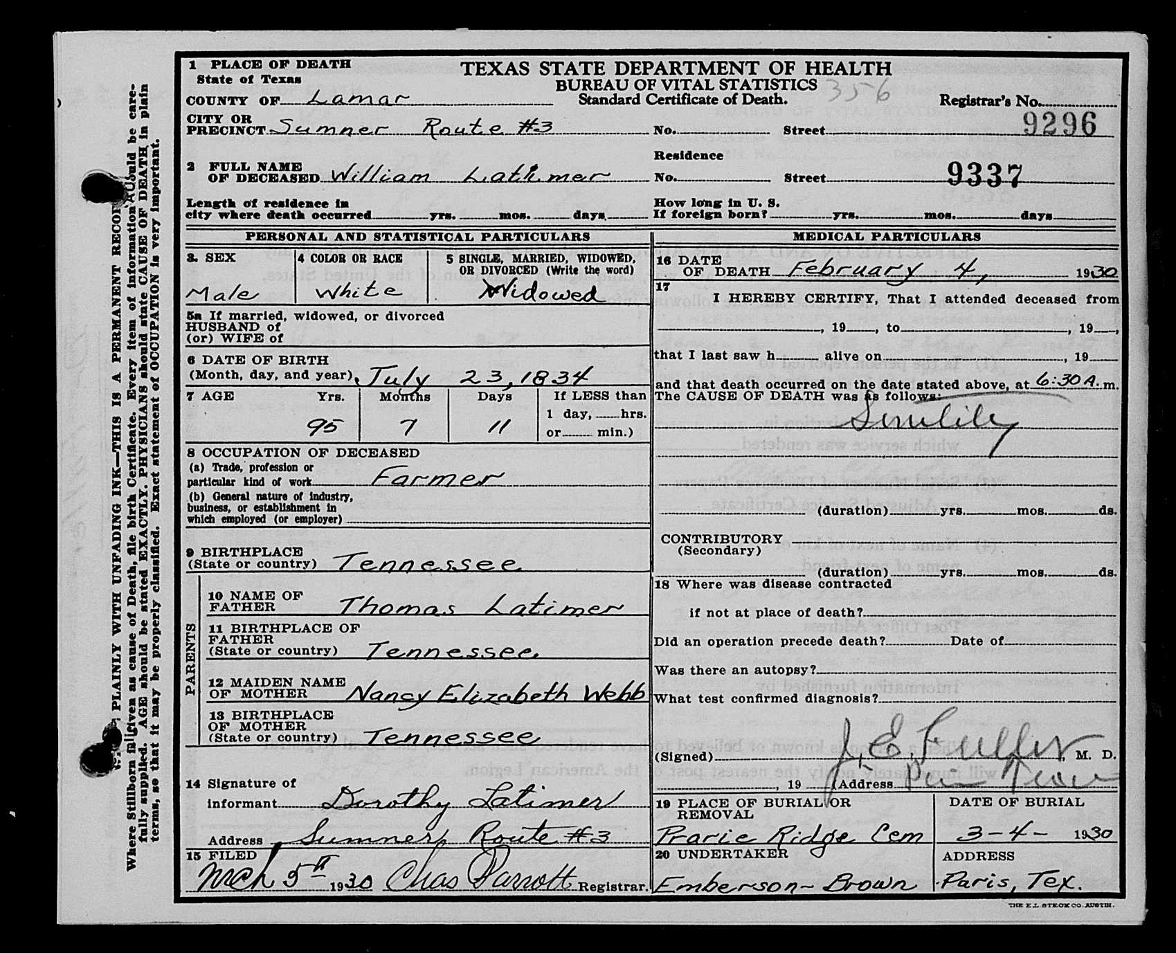 205. William Laimer, “Texas Deaths, 1890-1976,” February 4, 1930, Sumner, Lamar County, TX, https://familysearch.org/ark:/61903/1:1:K33Y-YVQ, Lists her as Nancy Elizabeth Webb.
