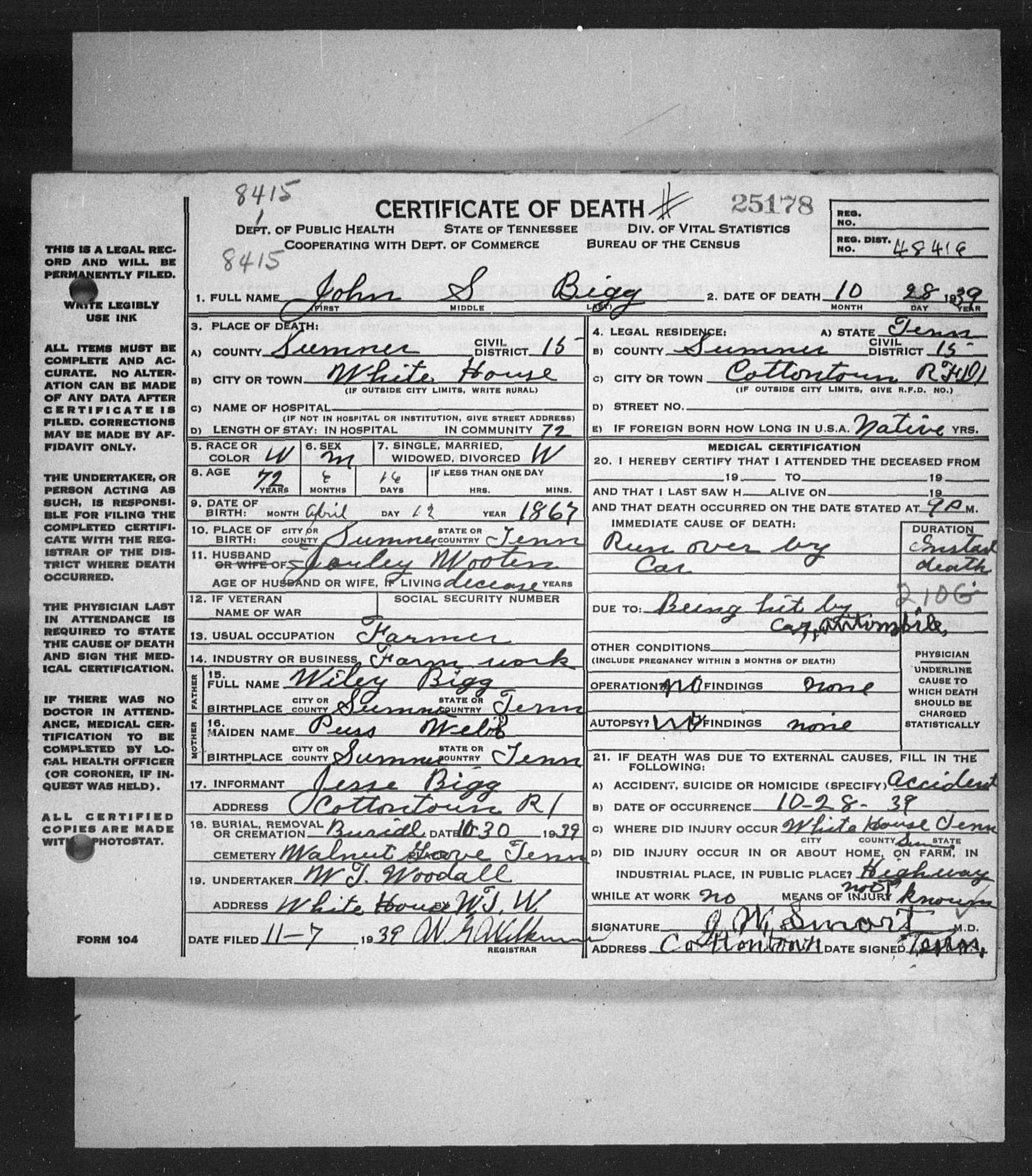 236. John S Biggs, “Tennessee Death Records, 1914-1955,” microfilm, digital folder number: 4183677-image number: 205-film number: 1876881-volume/page/certificate number: cn 25178, https://familysearch.org/pal:/MM9.1.1/NSSS-ZVQ.