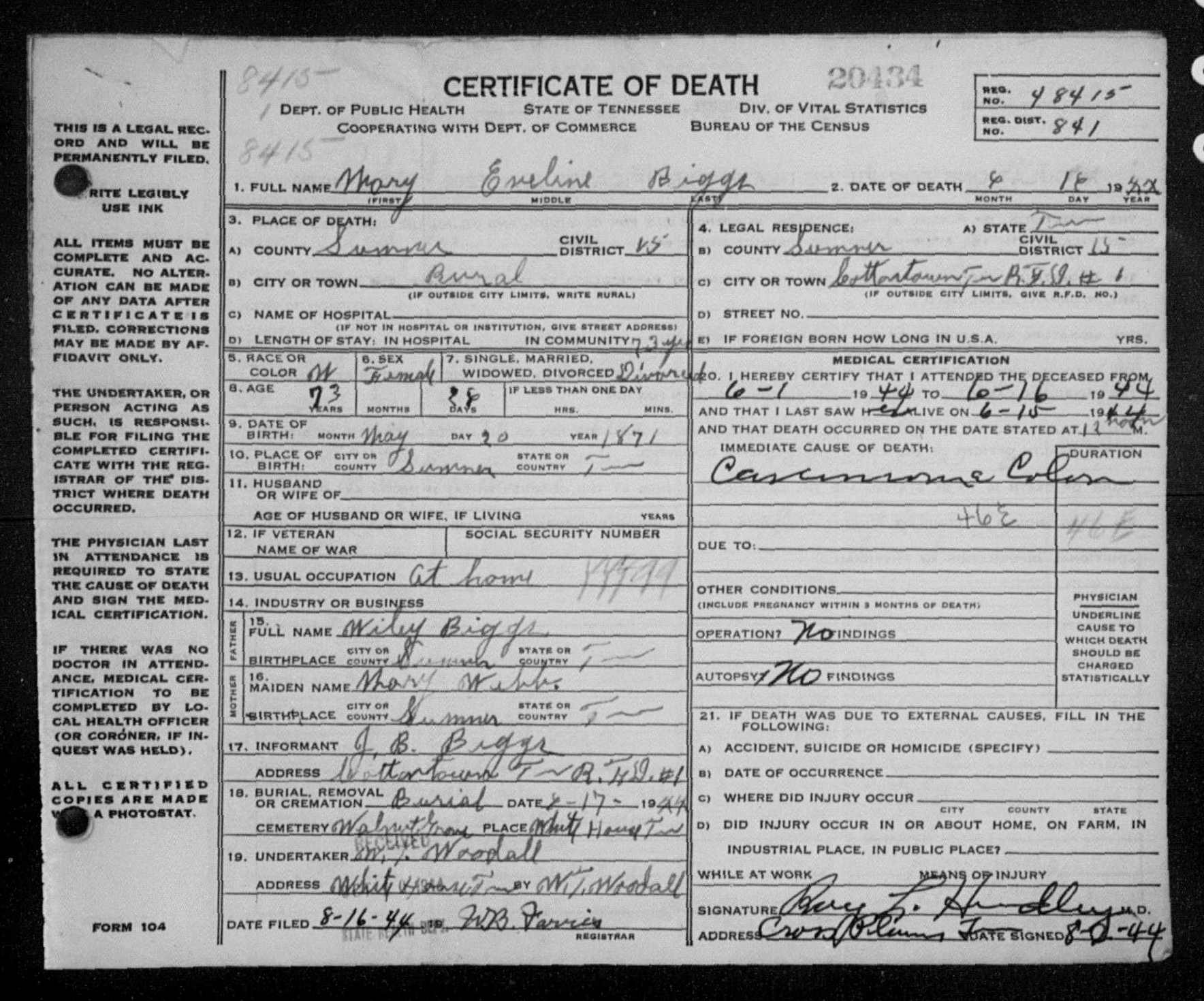 237. Mary Eveline Biggs, “Tennessee Death Records, 1914-1955,” microfilm, digital folder number: 4184893-image number: 499-film number: 2137351-volume/page/certificate number: cn 20434, https://familysearch.org/pal:/MM9.1.2/M147-RVR/p2.