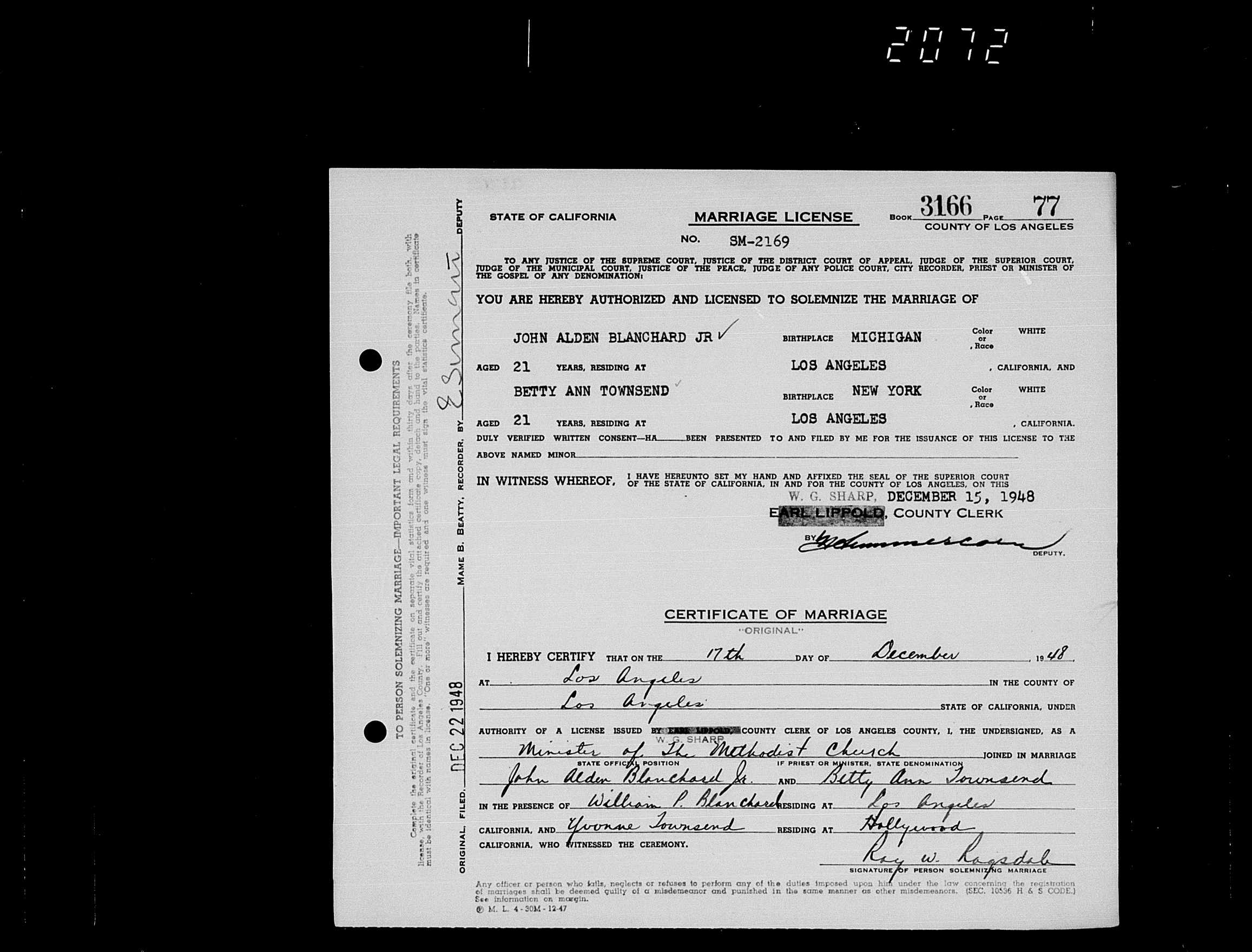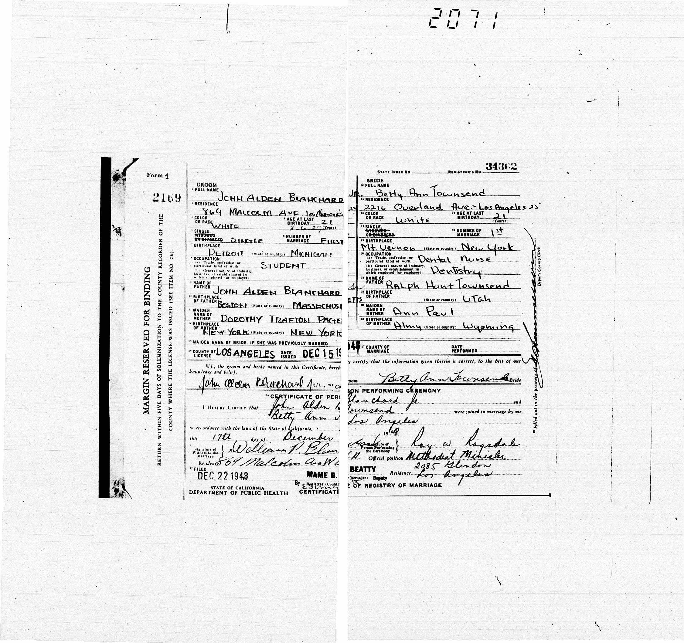 1056. John Alden Blanchard and Betty Ann Townsend, “California, County Marriages, 1850-1952,” December 17, 1948, Los Angeles County, CA, https://familysearch.org/ark:/61903/1:1:K8KL-8DL.