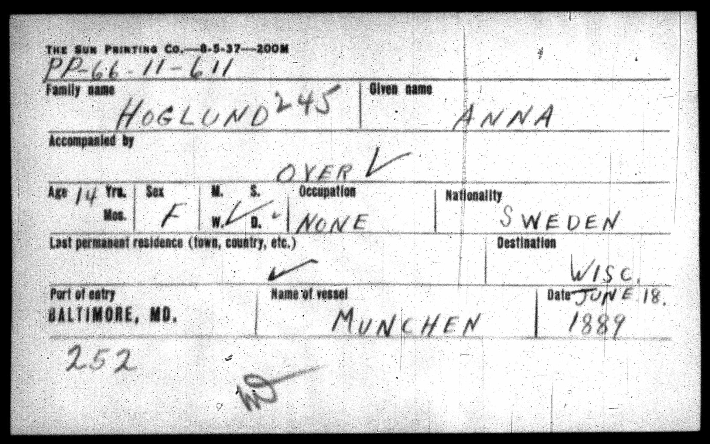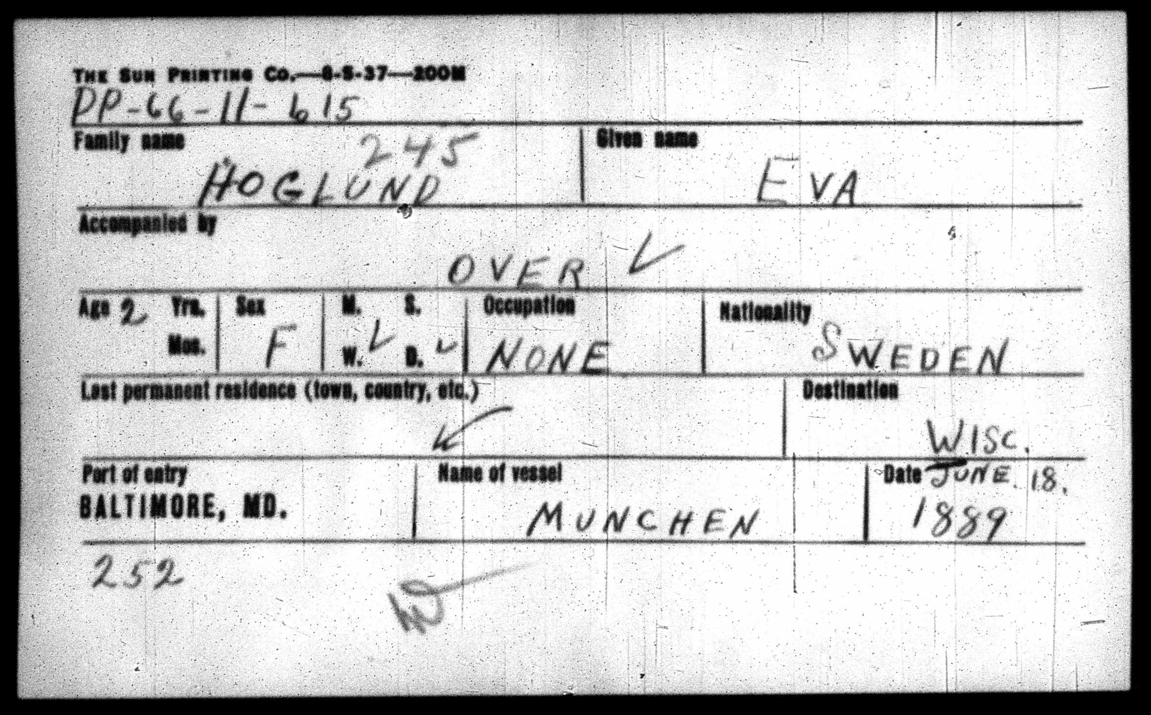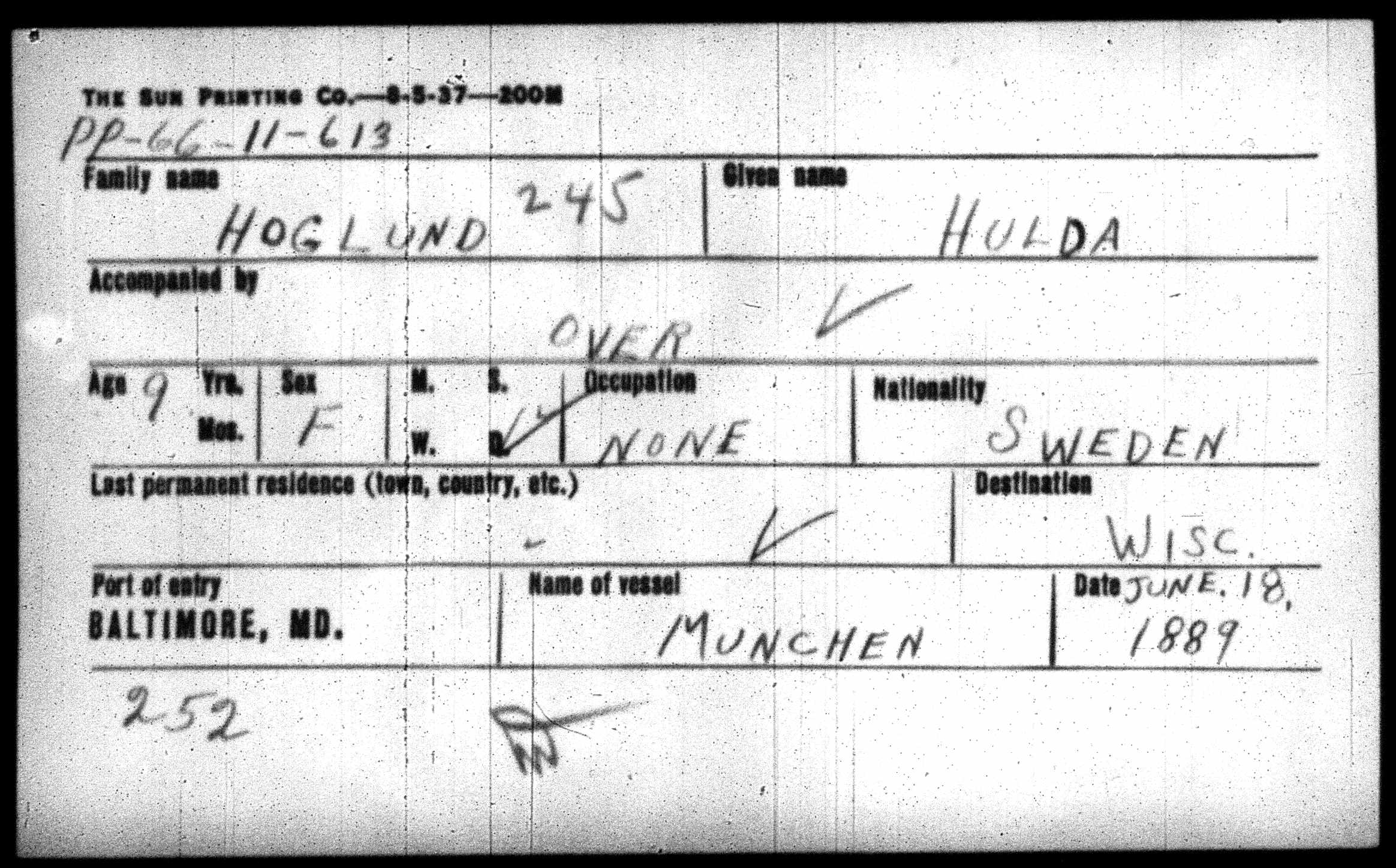 1064. “Baltimore, Maryland, Passenger List Card Index, 1820-1897,” June 18, 1889, Baltimore, Baltimore County, MD, PP-66-11-610.