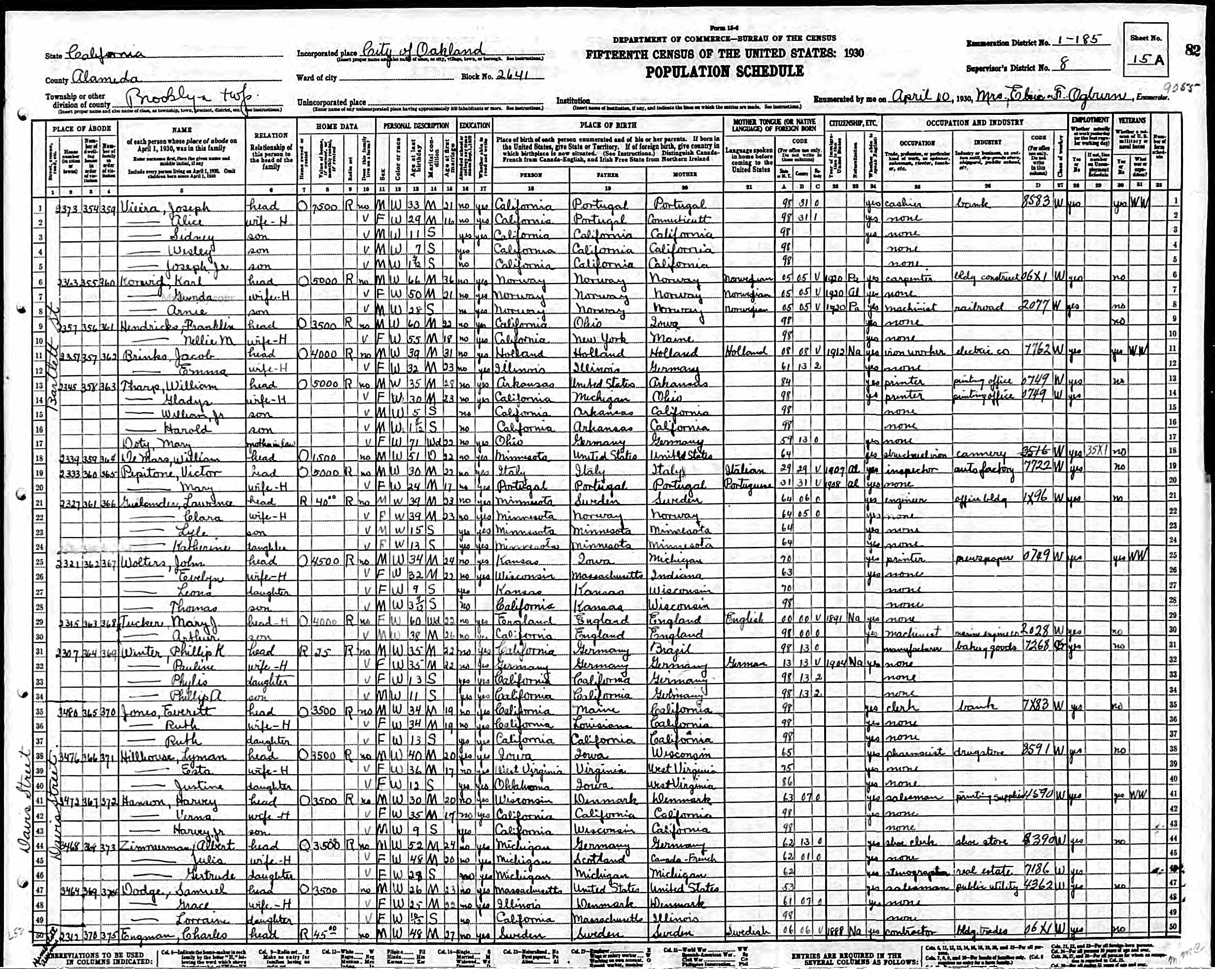 1071. “United States Census: 1930,” Bureau of the Census, US Dept. of Commerce, United States of America, 1930, CA, Alameda, Oakland, Brooklyn Township, April 10, 1930, Mrs. Elsie F Ogburn, 15A, 9, 1-185, T626, 108, 82, 164.
