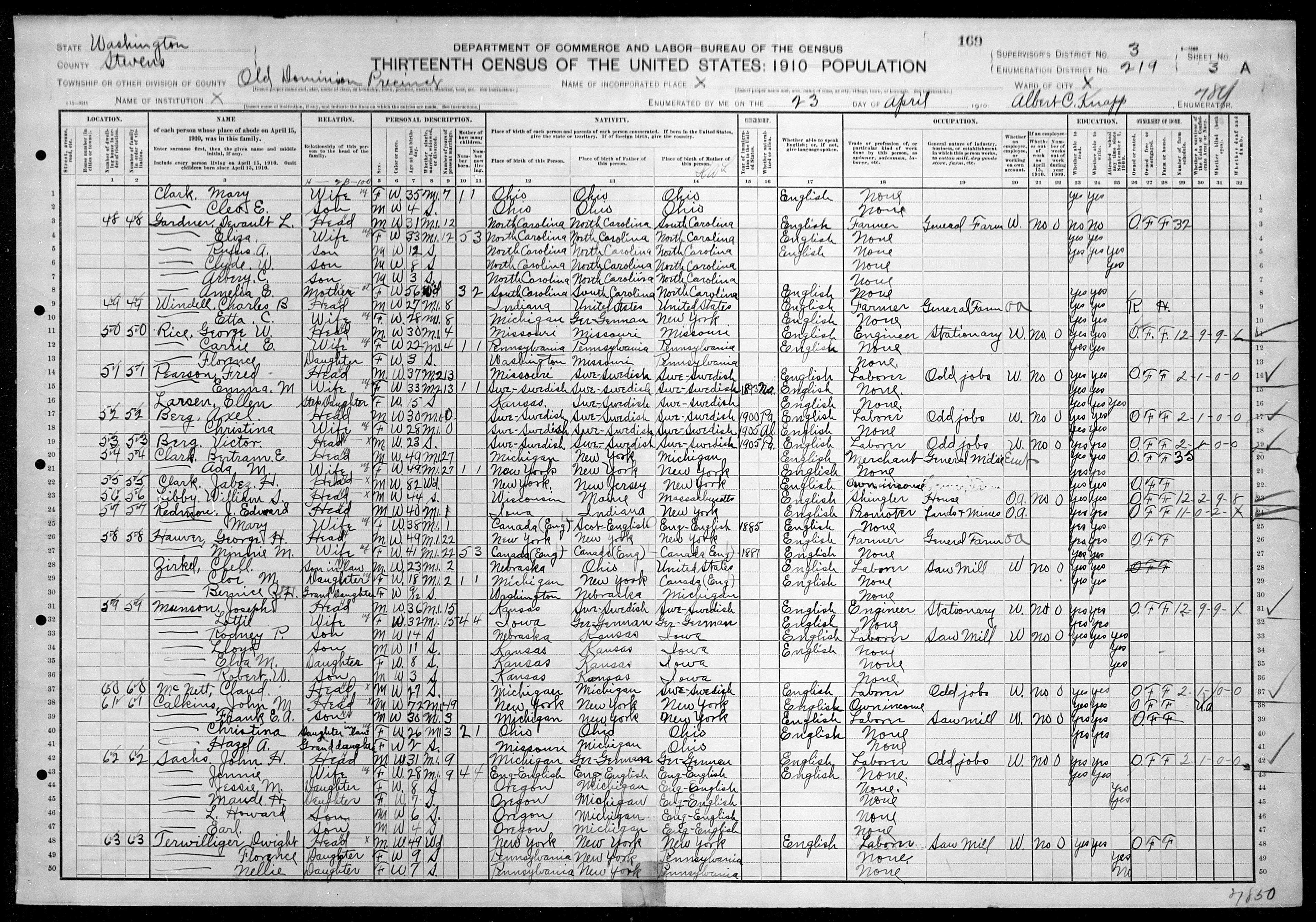 2219. “United States Census,” 1910, WA, Stevens, Old Dominion, 3A, 3, 219, T624, 1672, 169, 345, Bureau of the Census, US Dept. of Commerce, United States of America, April 23, 1910, Albert OC Knapp.
