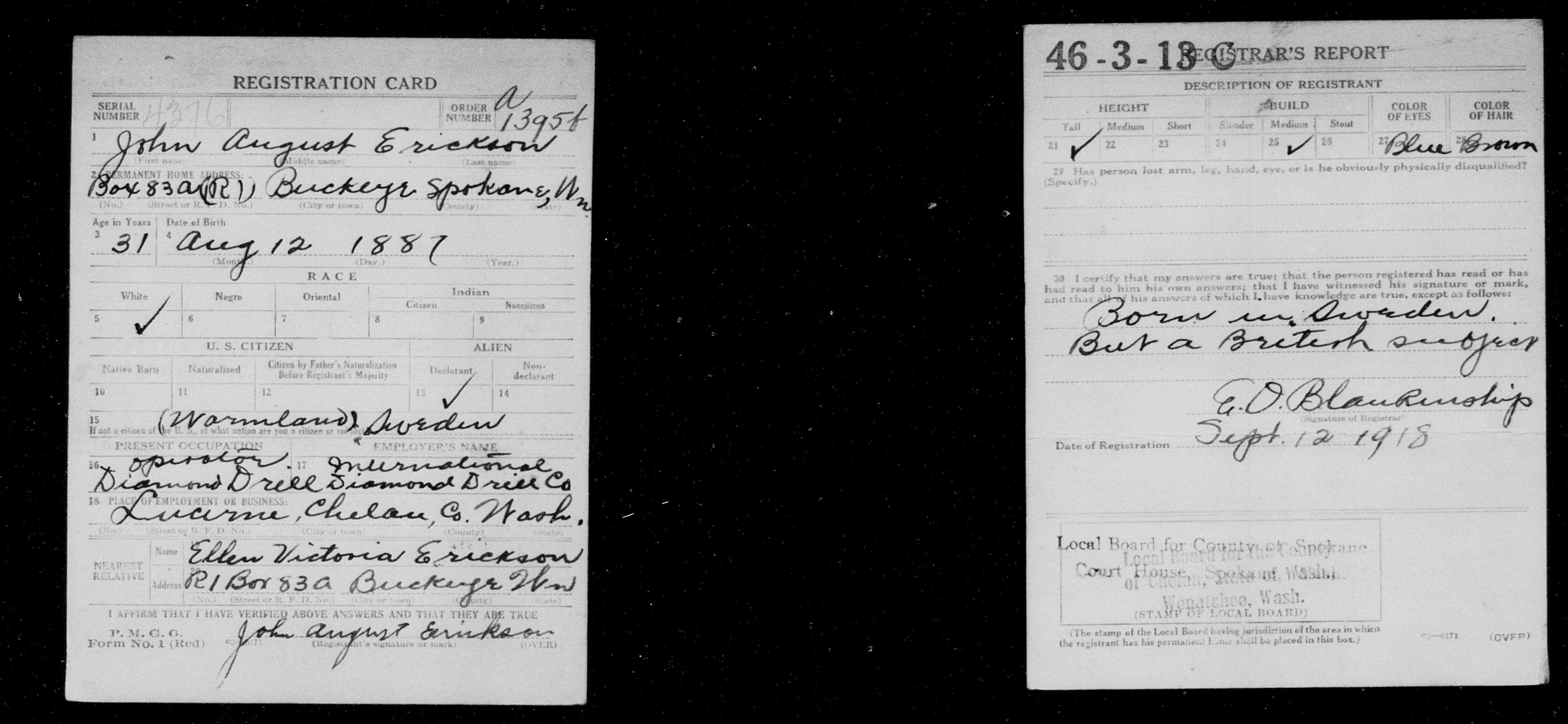 2223. Erickson, John August, World War I, 1918, Washington, 4376, “World War I Draft Cards,” September 12, 1918, Spokane, Spokane County, WA.