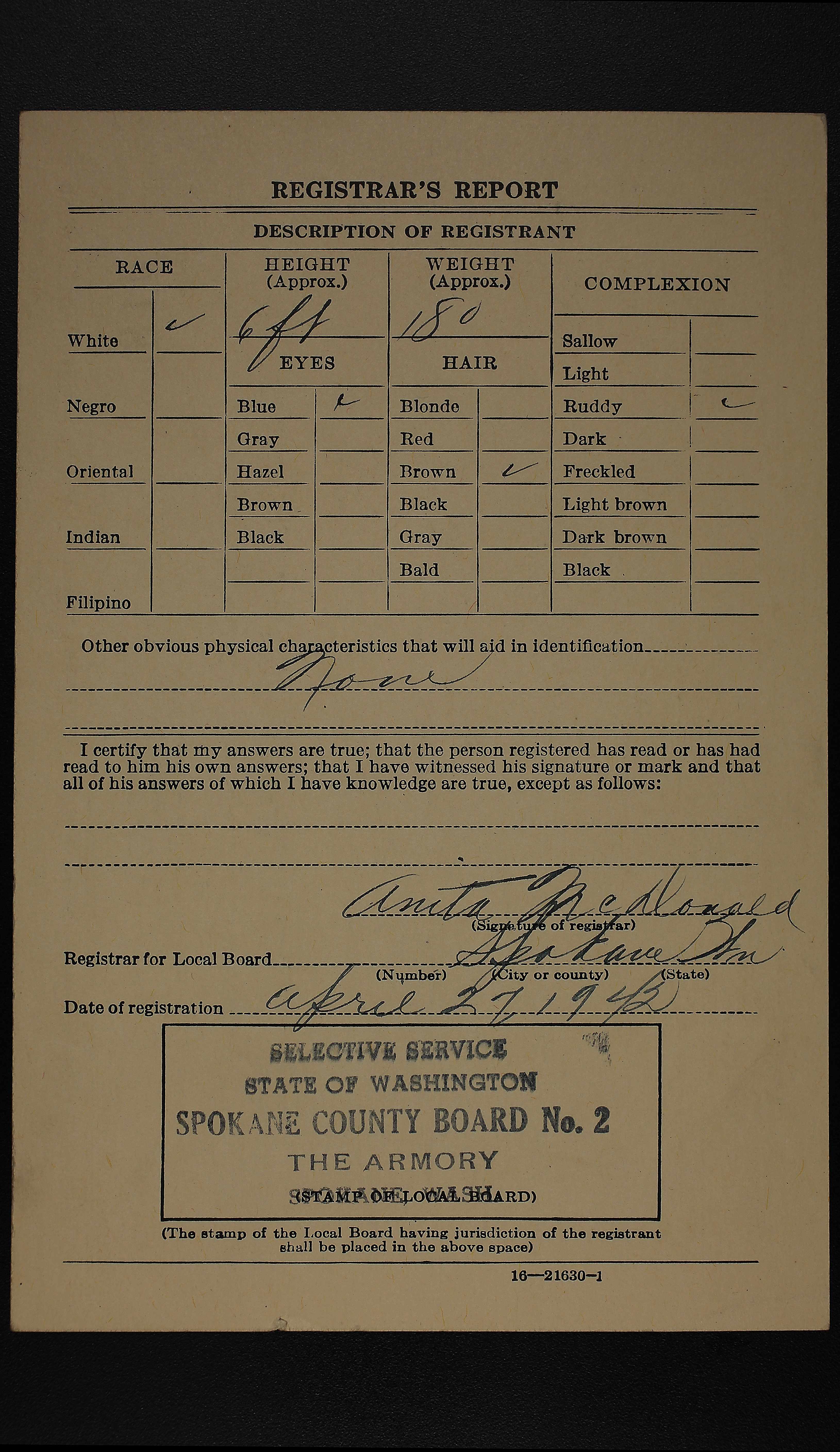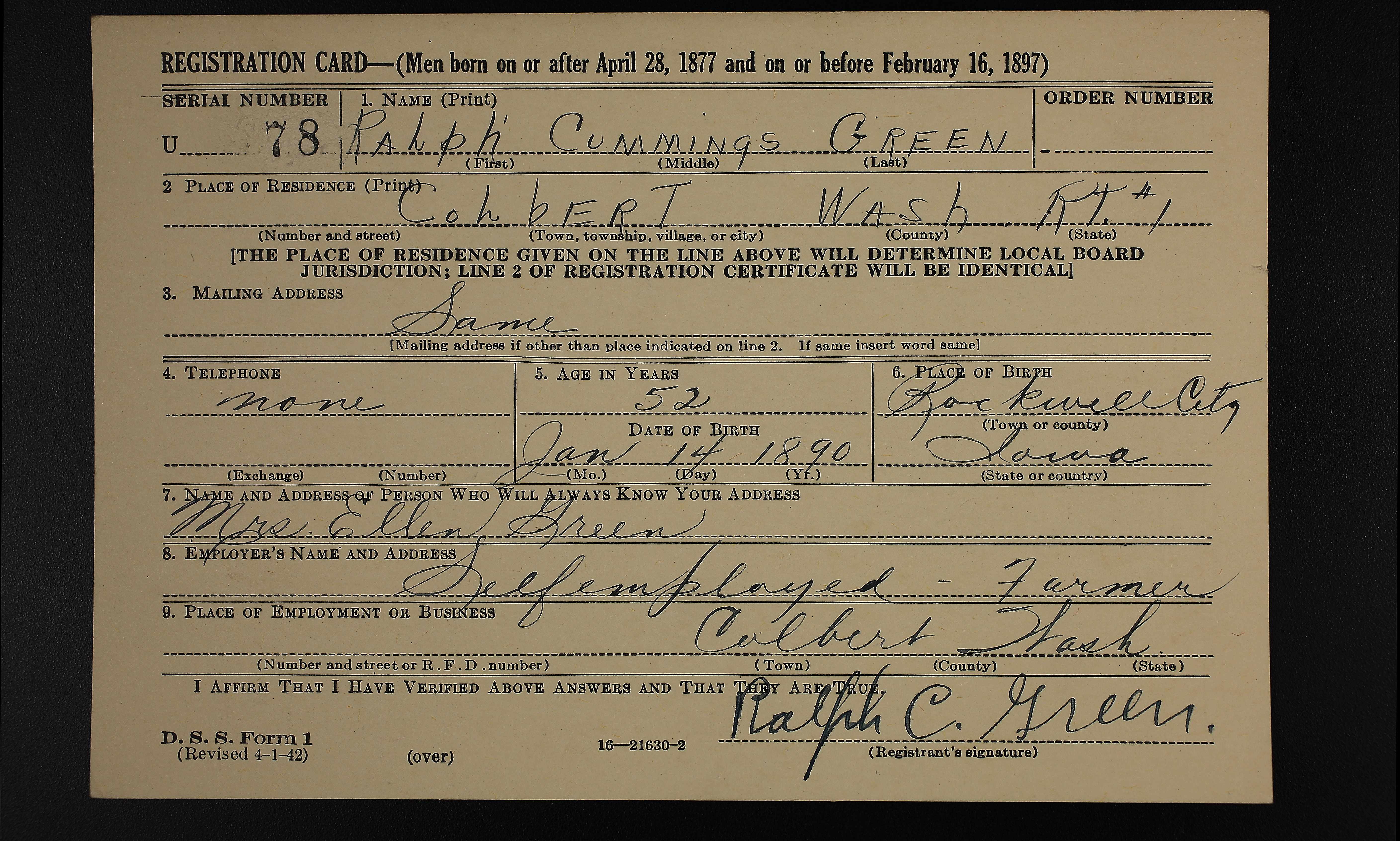 2227. Green, Ralph Cummings, World War II, 1942, Washington, U78, “World War II Draft Cards (4th Registration) for the State of Washington,” April 27, 1942, Spokane County, WA, https://familysearch.org/ark:/61903/1:1:QVJT-JGD3.