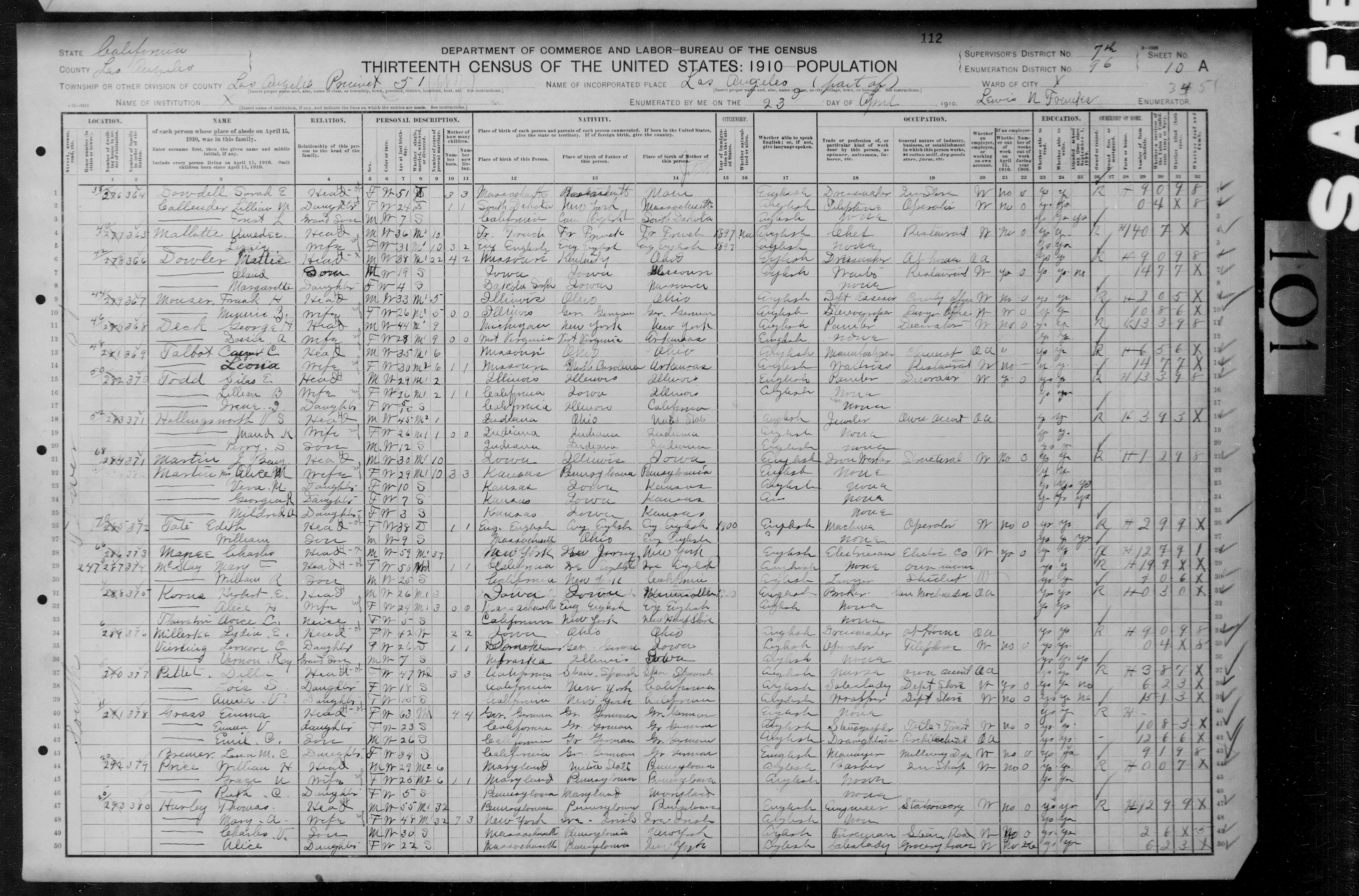 2712. “United States Census,” 1910, CA, Los Angeles, Los Angeles, Assembly District 75, 10A, 7, 96, T624, 940, Bureau of the Census, US Dept. of Commerce, United States of America, April 23, 1910, Lewis N Fowler.