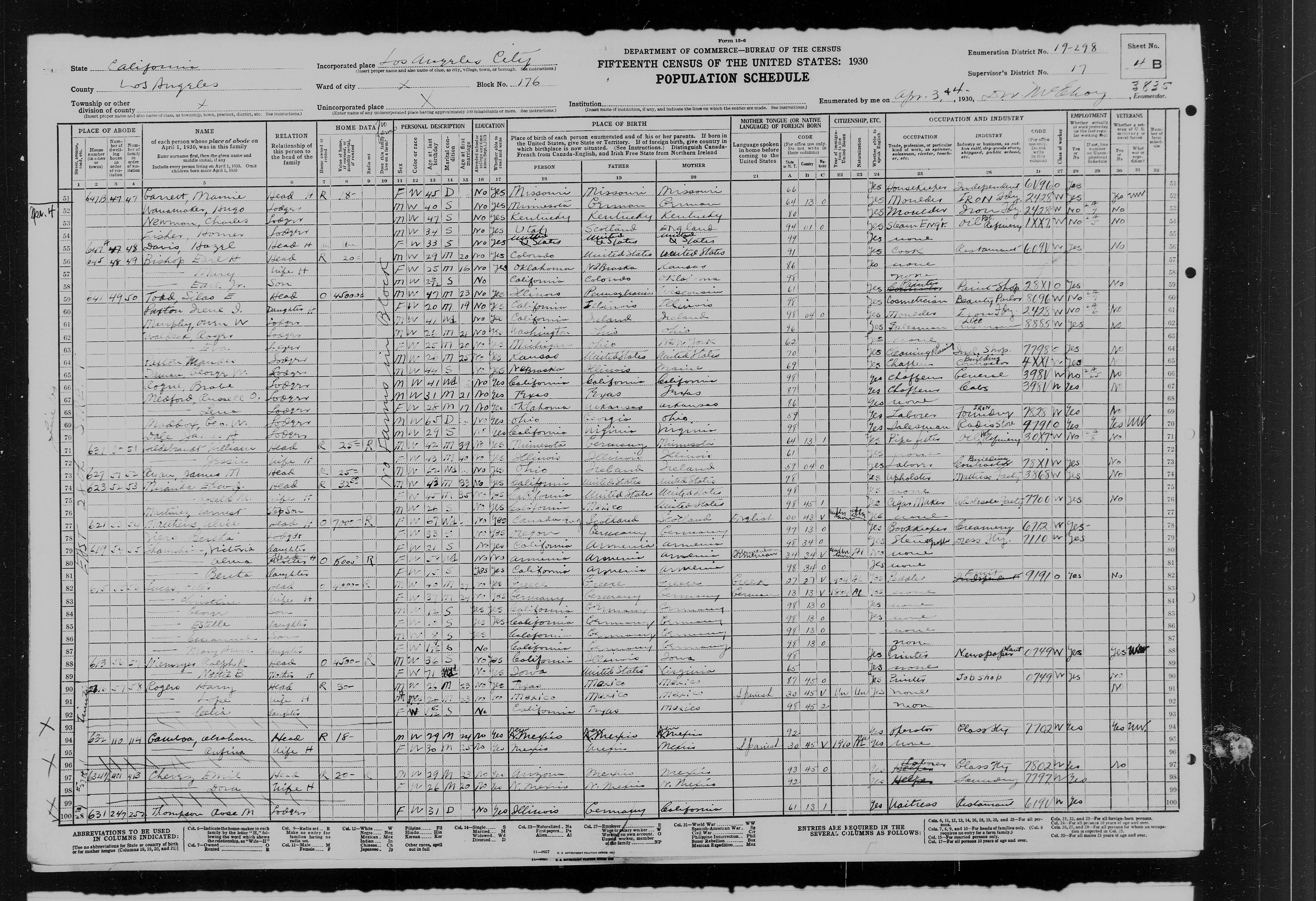 2713. “United States Census: 1930,” 1930, CA, Los Angeles, Los Angeles, 4B, 17, 19-298, T626, 144, 409, Bureau of the Census, US Dept. of Commerce, United States of America, April 4, 1930, D W McElroy.