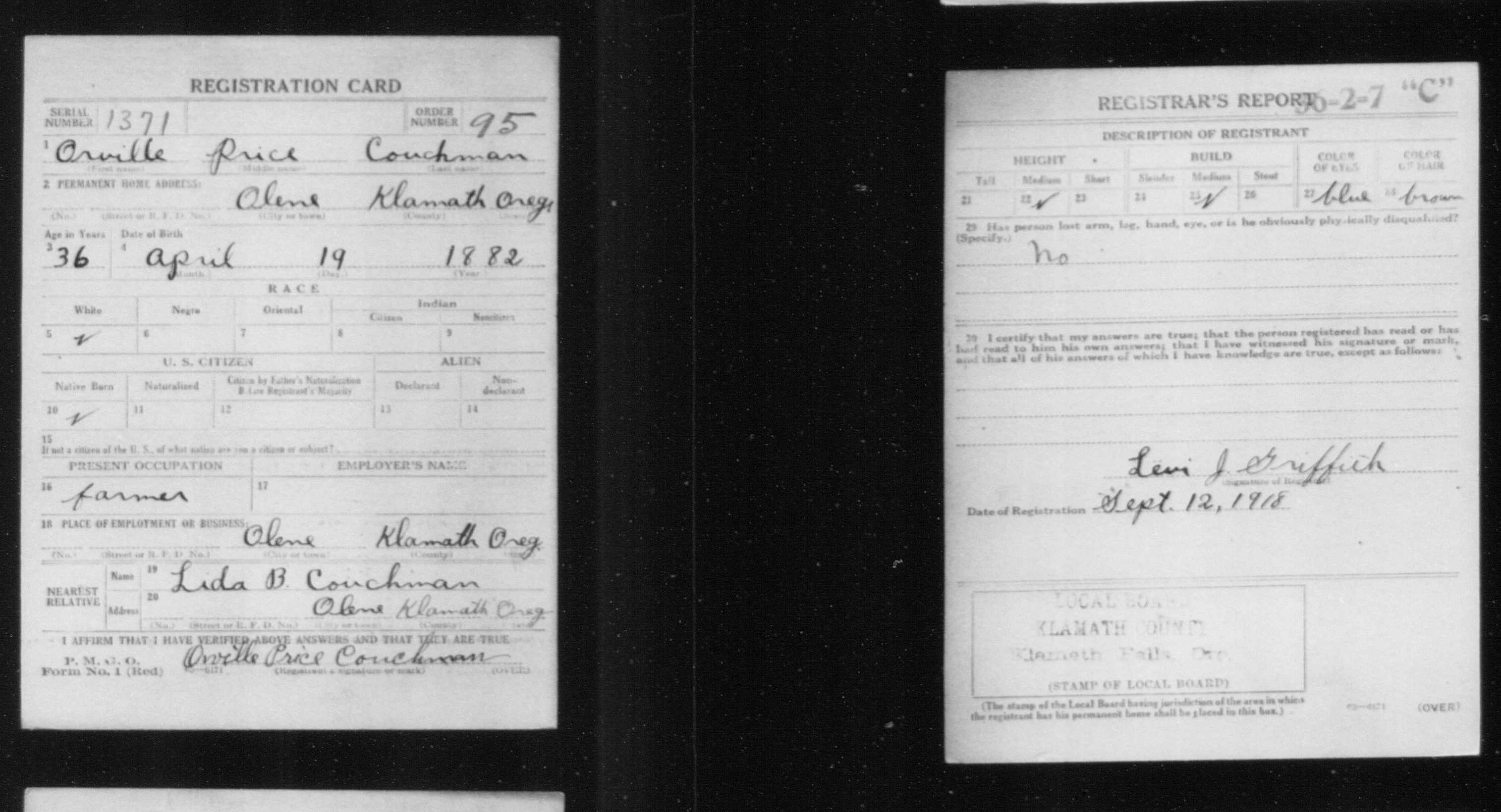 2716. World War I, 1918, Oregon, 1371, Couchman, Orville Price, “World War I Selective Service System Draft Registration Cards,” September 12, 1918, Klamath Falls, Klamath County, OR, USA, Affiliate Publication Number: M1509 , GS Film Number: 1852058 , Digital Folder Number: 005243380 , Image Number: 04430, https://familysearch.org/pal:/MM9.1.1/K6Z5-JNK.