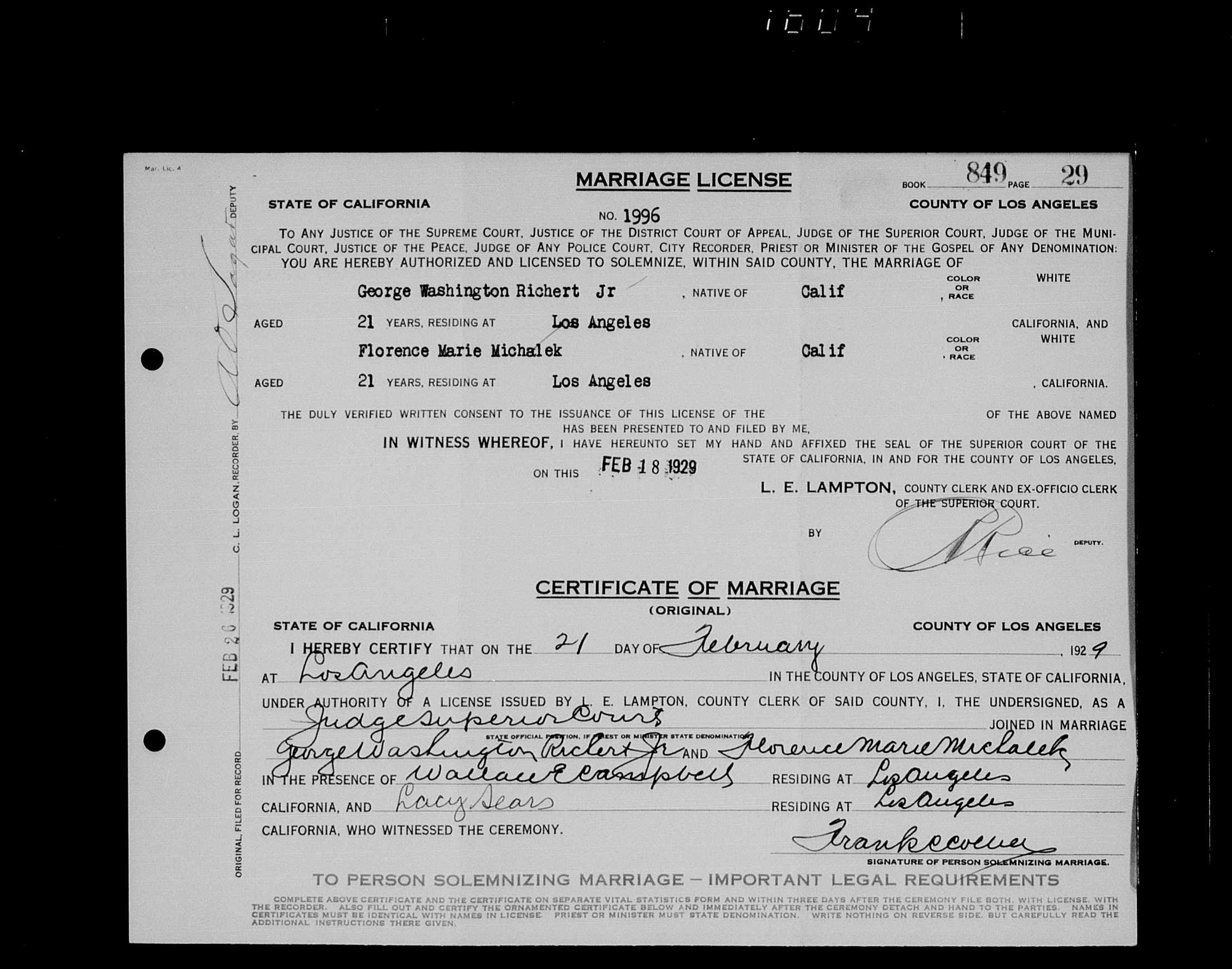 2719. “California, County Marriages, 1850-1952,” George Washington Richert and Florence Marie Michalek, February 21, 1929, Los Angeles County, CA, USA, Page: 29-GS Film number: 2074756-Digital Folder Number: 005698478-Image Number: 01594, https://familysearch.org/pal:/MM9.1.1/K8NP-8D3.