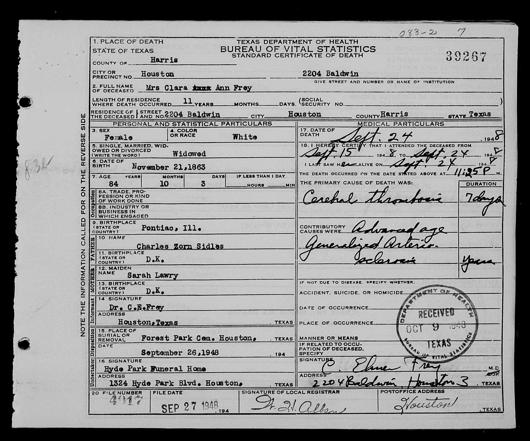 6404. Clara Ann Frey, “Texas, Deaths, 1890-1976,” September 24, 1948, Houston, Harris County, TX, GS Film number: 2218965 , Digital Folder Number: 005145045 , Image Number: 02756, https://familysearch.org/ark:/61903/1:1:K39R-8P2.