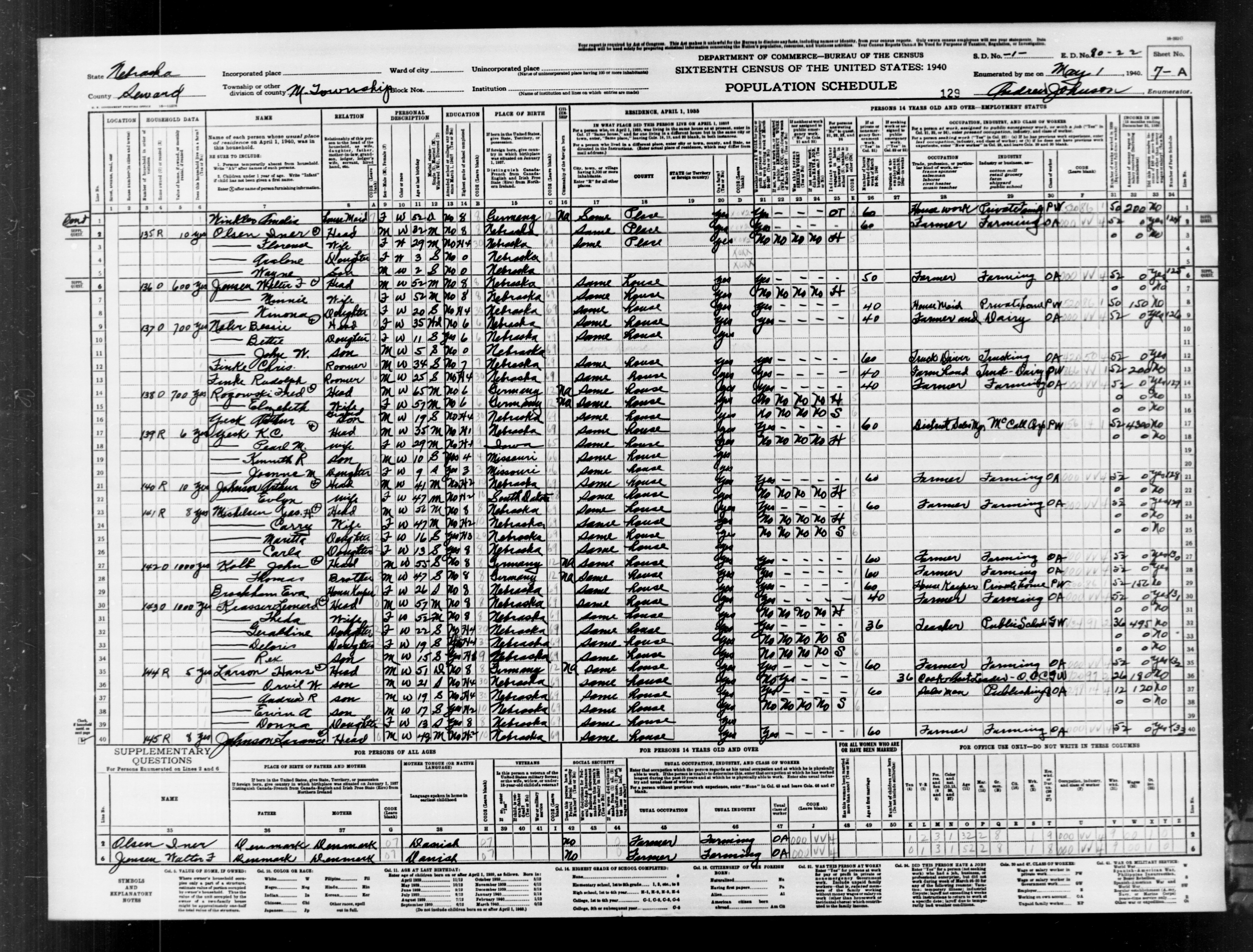 6583. “United States Census,” 1940, NE, Seward, Township M, 7A, 1, 80-22, T627, 2265, 274, Bureau of the Census, US Dept. of Commerce, United States of America, May 1, 1940, Andrew Johnson.