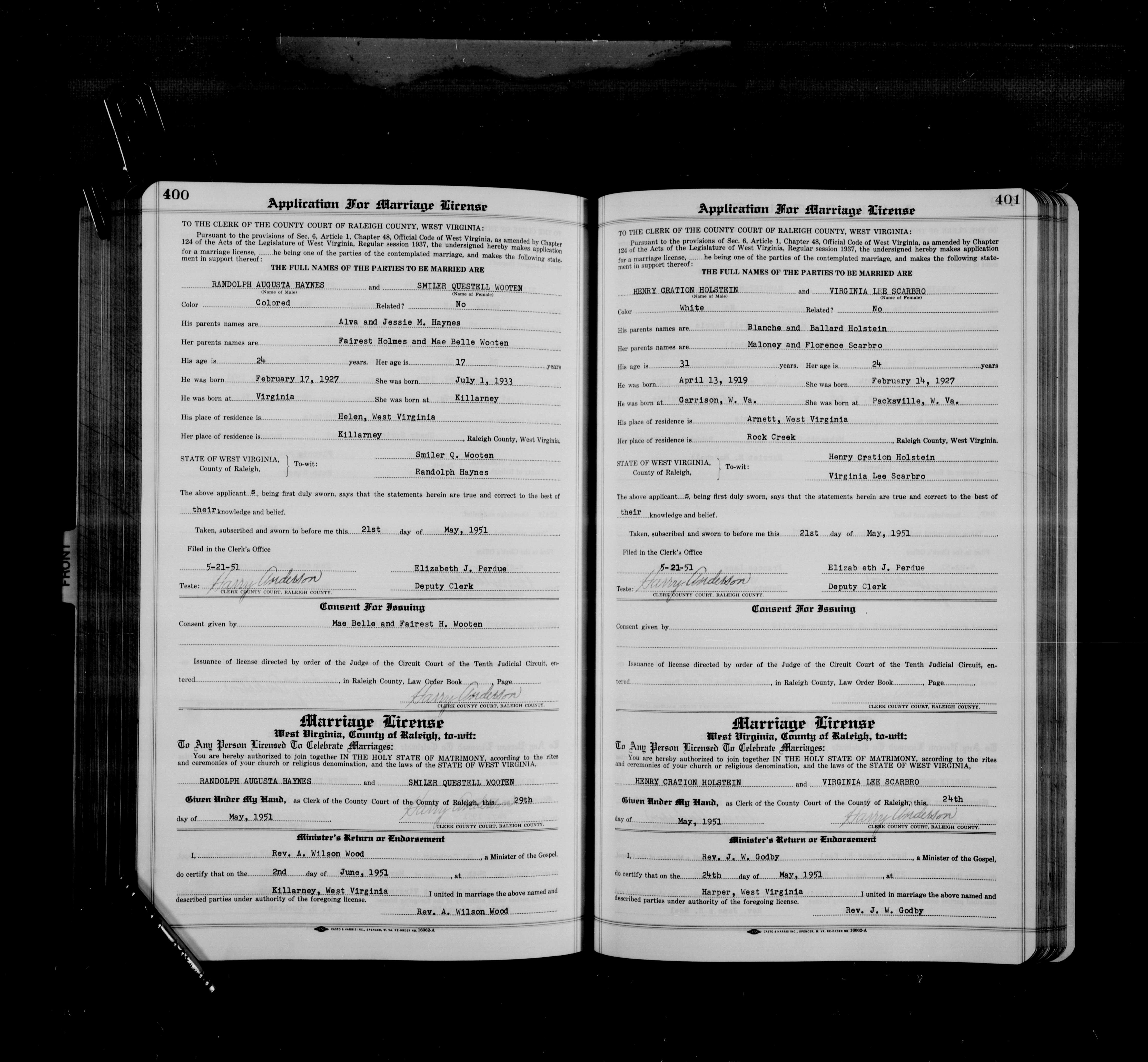 9227. Henry Cration Holstein and Virginia Lee Scarbro, “West Virginia Marriage Records,” May 24, 1951, Harper, Raleigh County, WV, http://www.wvculture.org/vrr/va_view2.aspx?FilmNumber=801755&ImageNumber=503.