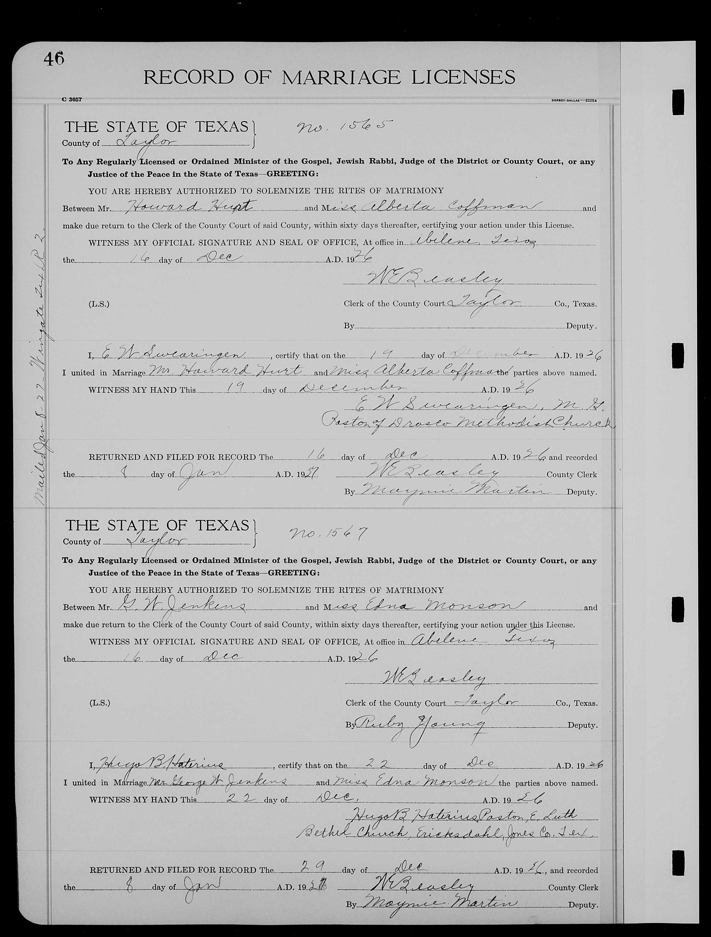 9242. George W Jenkins and Edna Monson, “Texas, County Marriage Records, 1837-1965,” December 22, 1926, Taylor, TX, https://familysearch.org/ark:/61903/1:1:QV1Z-3N4L.