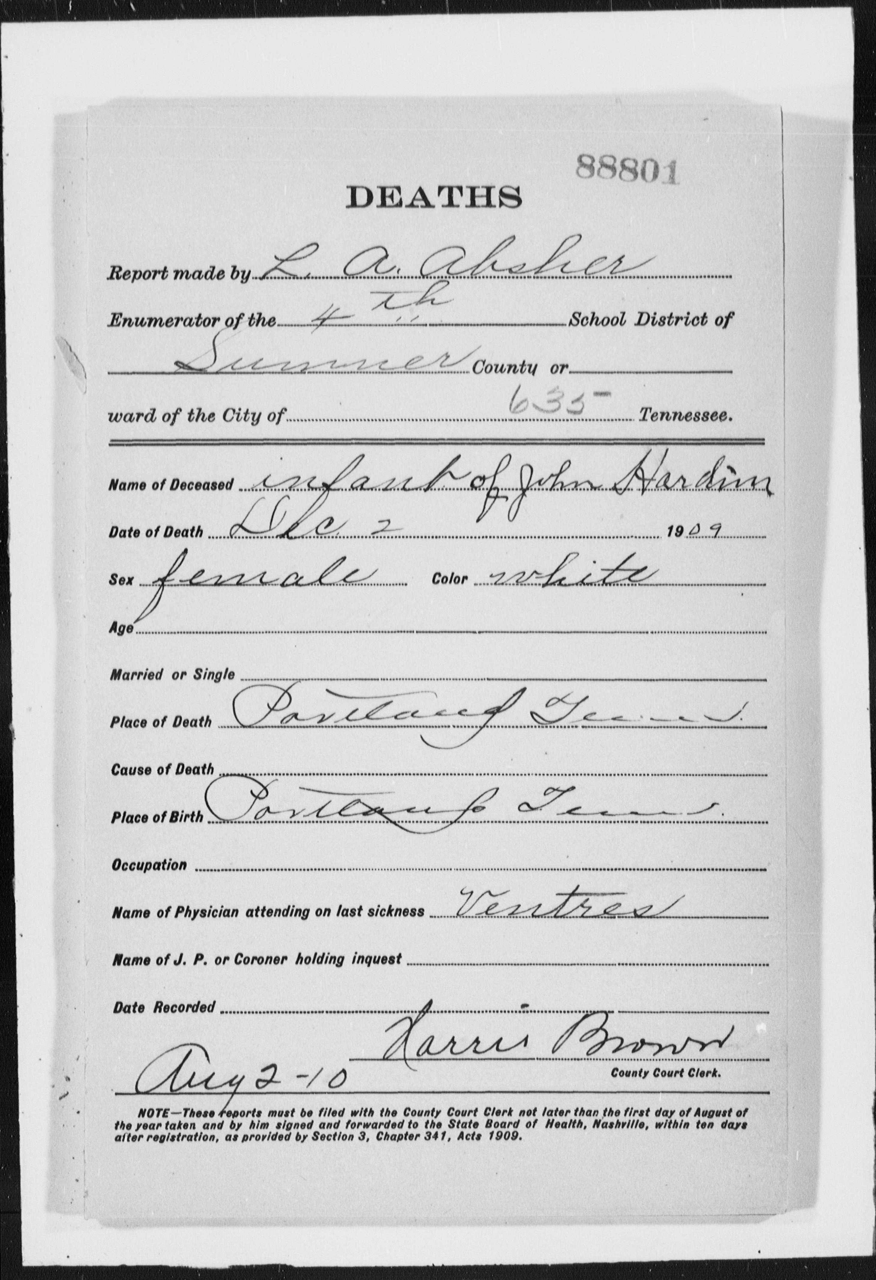 9975. Infant Hardin, “Tennessee Deaths and Burials, 1874-1955--,” December 2, 1909, Portland, Sumner County, TN, https://www.familysearch.org/ark:/61903/1:1:F6R2-3ZP.
