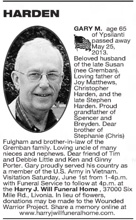 9981. “In Remembrance,” Gary M Harden, Detroit Free Press, Detroit, MI, May 31, 2013, A6.