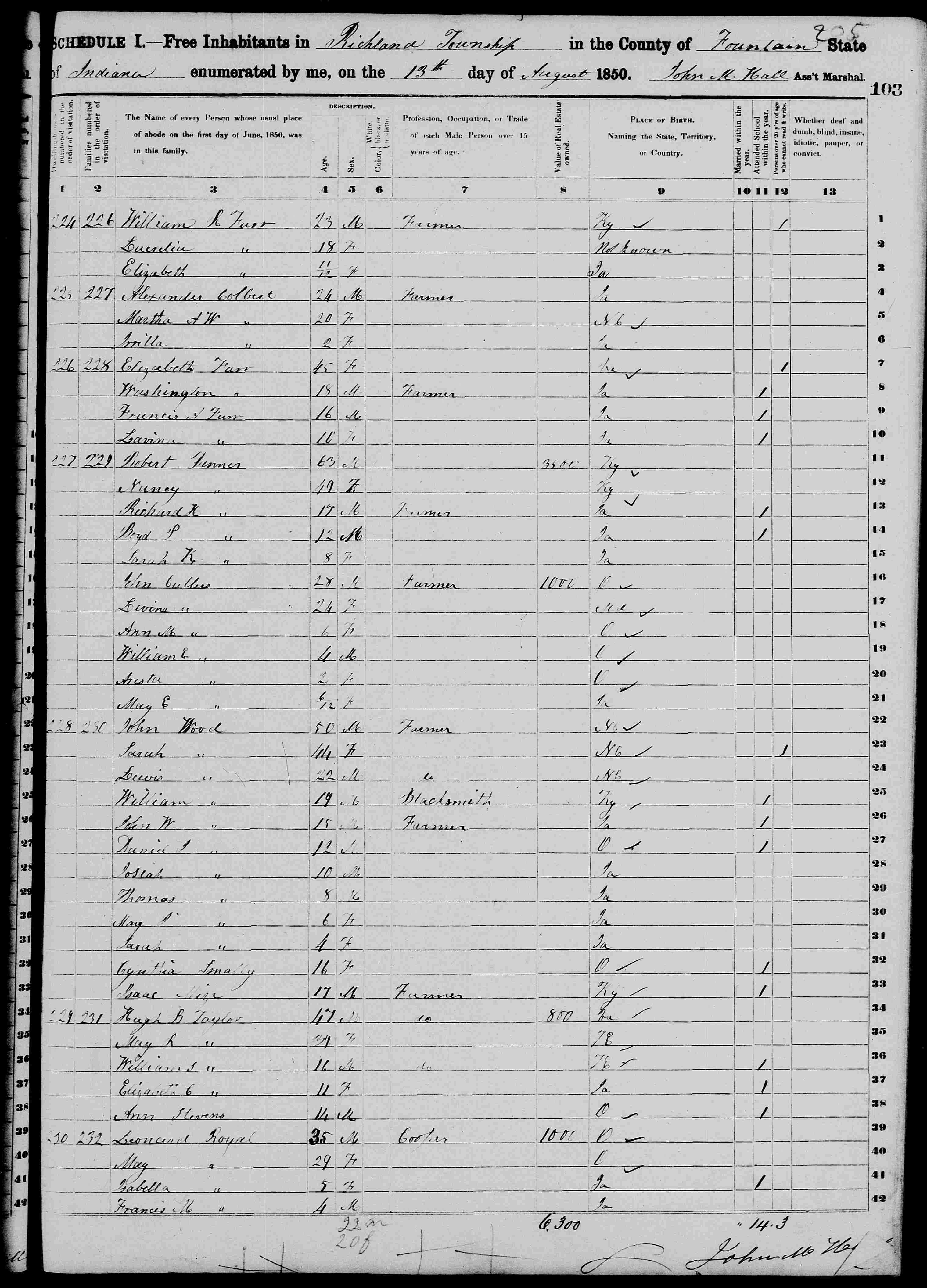 9990. “United States Census,” 1850, IN, Fountain, Richland, 103, M432, 571, Bureau of the Census, US Dept. of Commerce, United States of America, August 13 1850, John M Hall.
