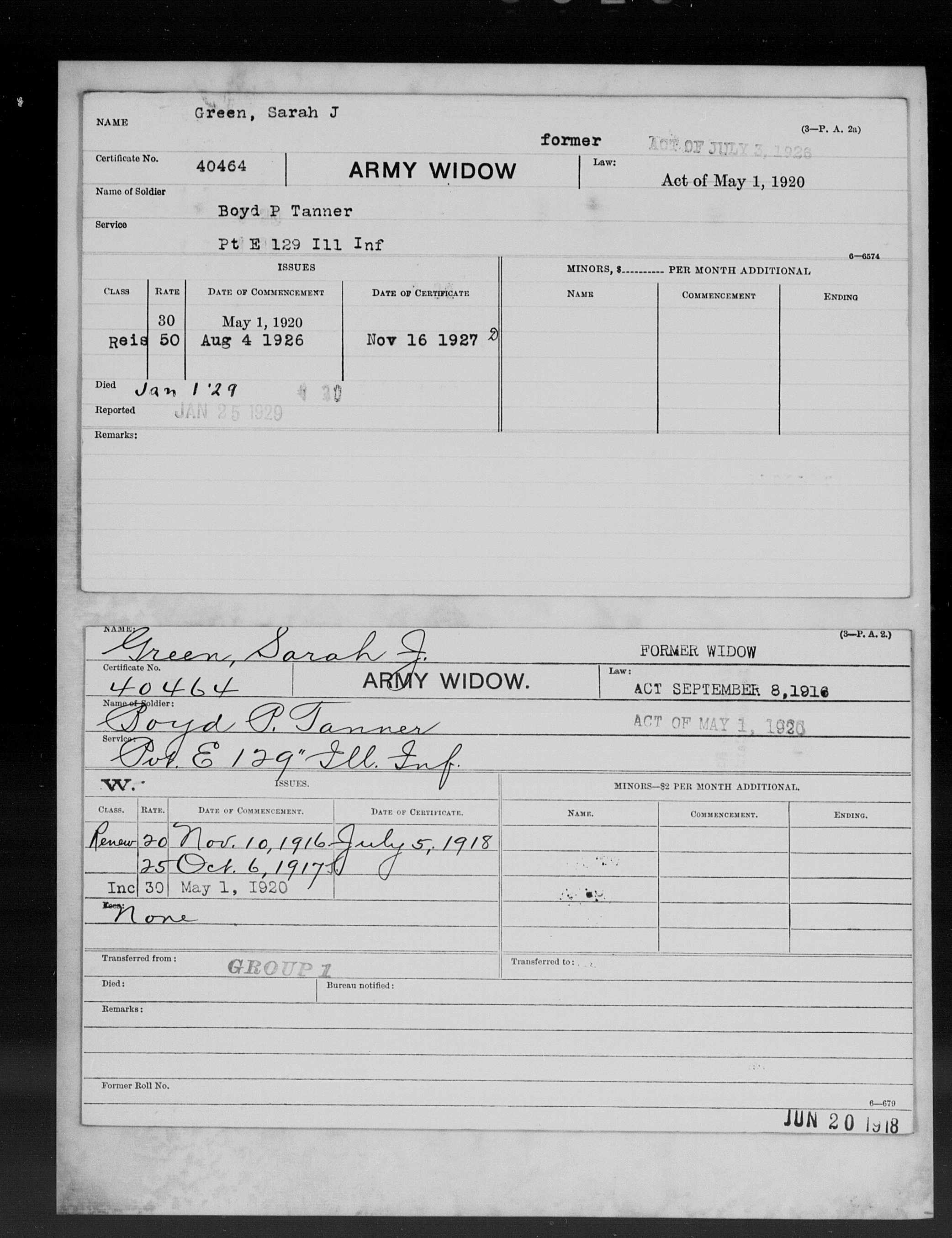 9993. Sarah J Green, widow of Boyd P Tanner, “United States Veterans Administration Pension Payment Cards, 1907-1933,” https://www.familysearch.org/ark:/61903/1:1:K64K-8F4.