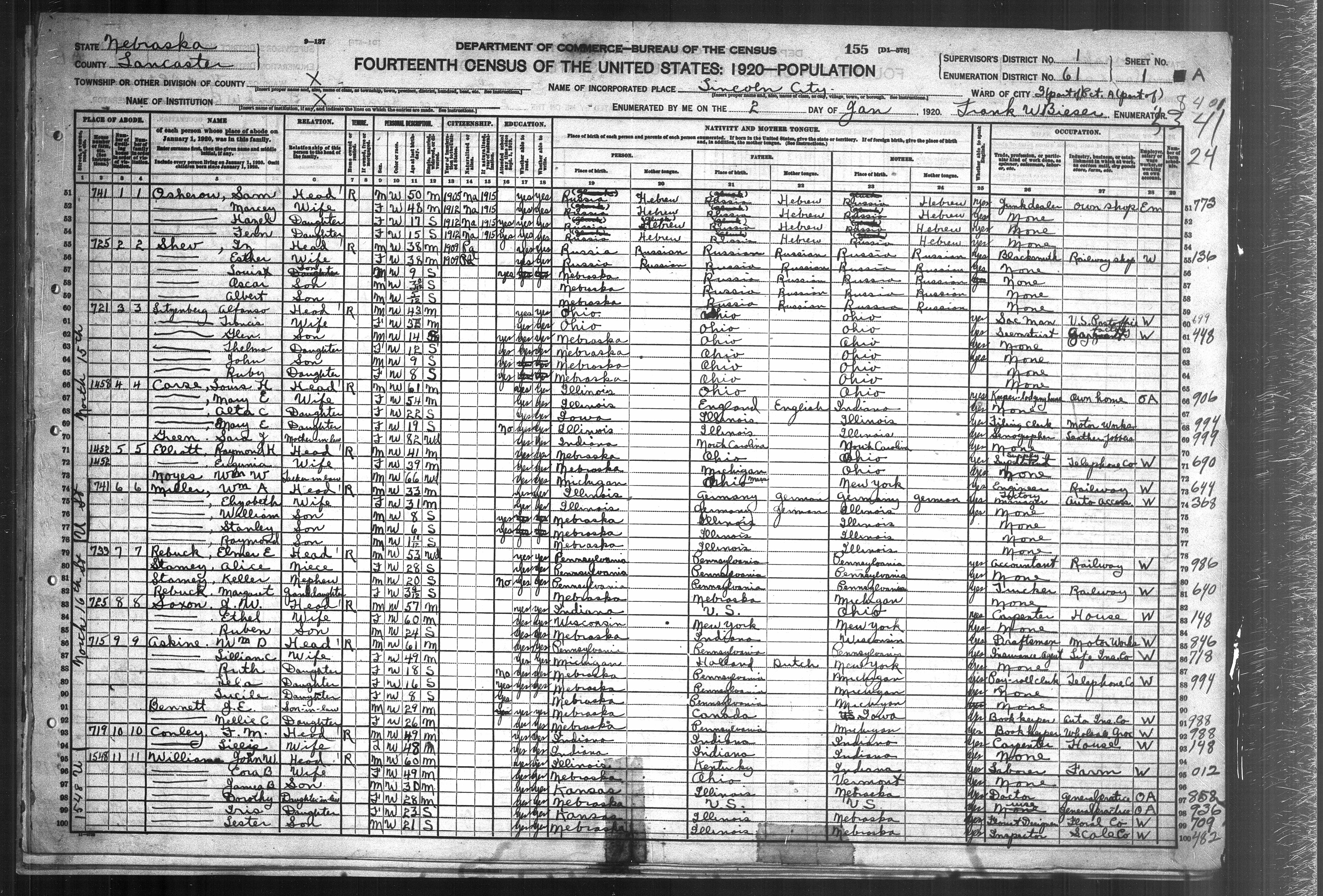 9996. “United States Census,” 1920, NE, Lancaster, Lincoln, Ward 3, 1A, 1, 61, T625, 1820996, 315, Bureau of the Census, US Dept. of Commerce, United States of America, January 2, 1920, Frank W Bieser.