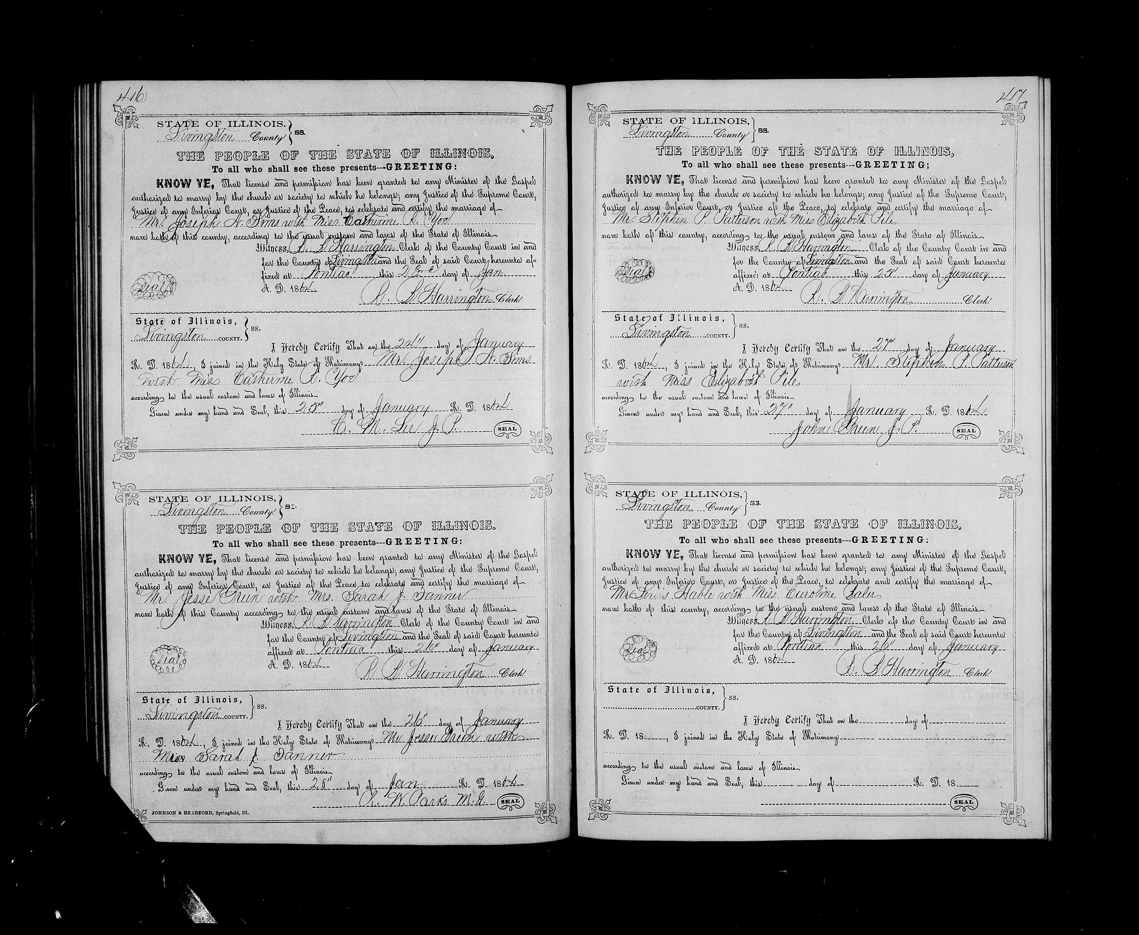 9997. Jesse Green and Sarah J Tanner, “Illinois, County Marriages, 1810-1940,” January 26, 1864, Livingston County, IL, https://www.familysearch.org/ark:/61903/1:1:KFLW-JL7.