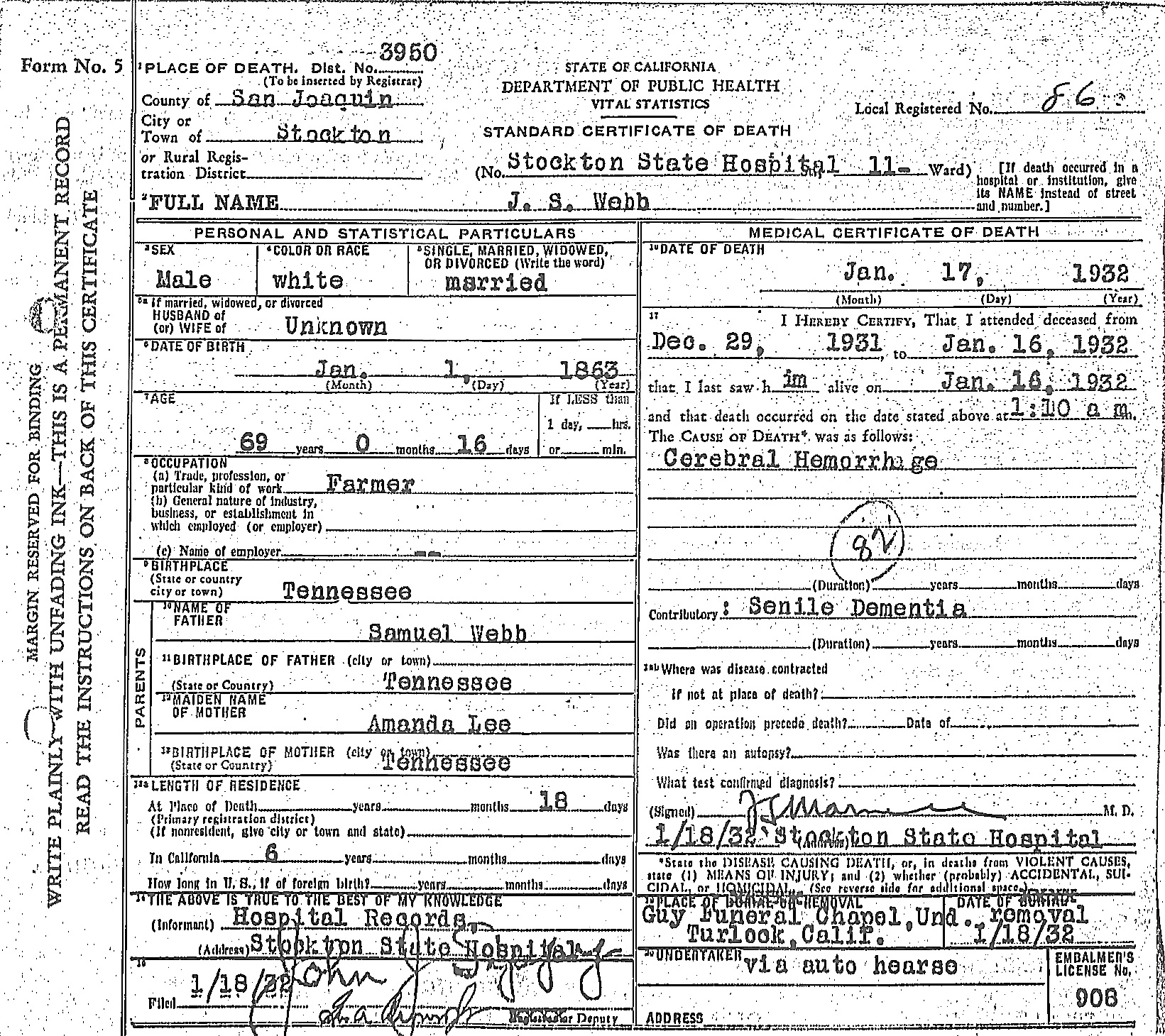 51. John Smith Webb, “California, County Birth and Death Records, 1800-1994,” January 17, 1932, Stockton, San Joaquin County, CA, https://www.familysearch.org/ark:/61903/1:1:QV37-J7M9, Says birth on January 1, 1863.