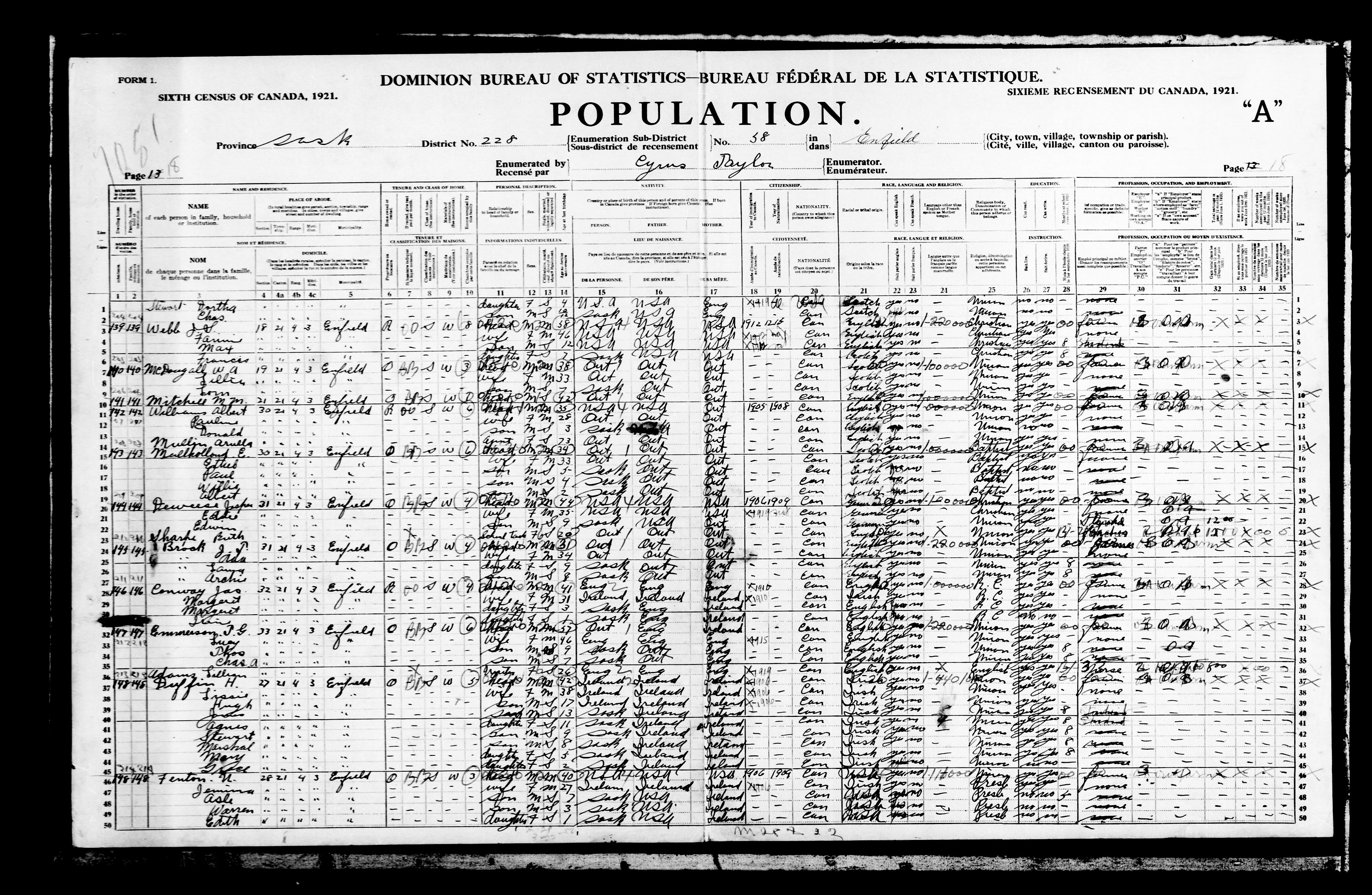 62. “Canada Census,” National Archives of Canada, Ottawa, Ontario, 1921, SK, Enfield, 228-58, 18A, Cyrus Taylor.