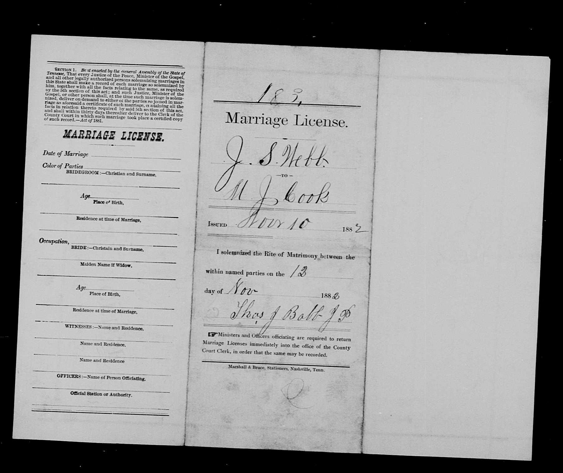 Files (3): WEBB, J.S. & COOK, M.J. - 12Nov1882, JSWebb_MJCook_MarriageLicense, JSWebb_MJCook_MarriageRecord
