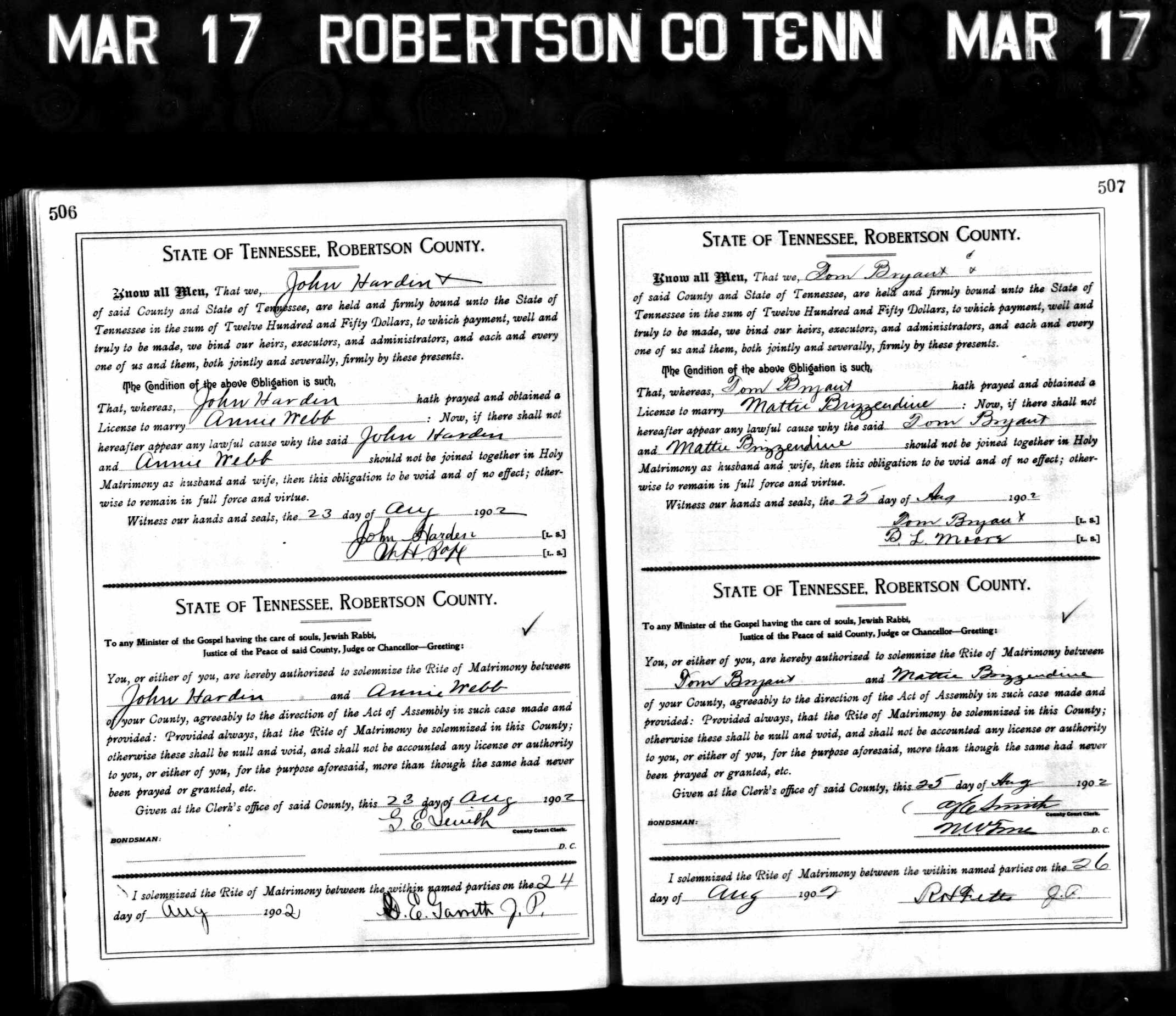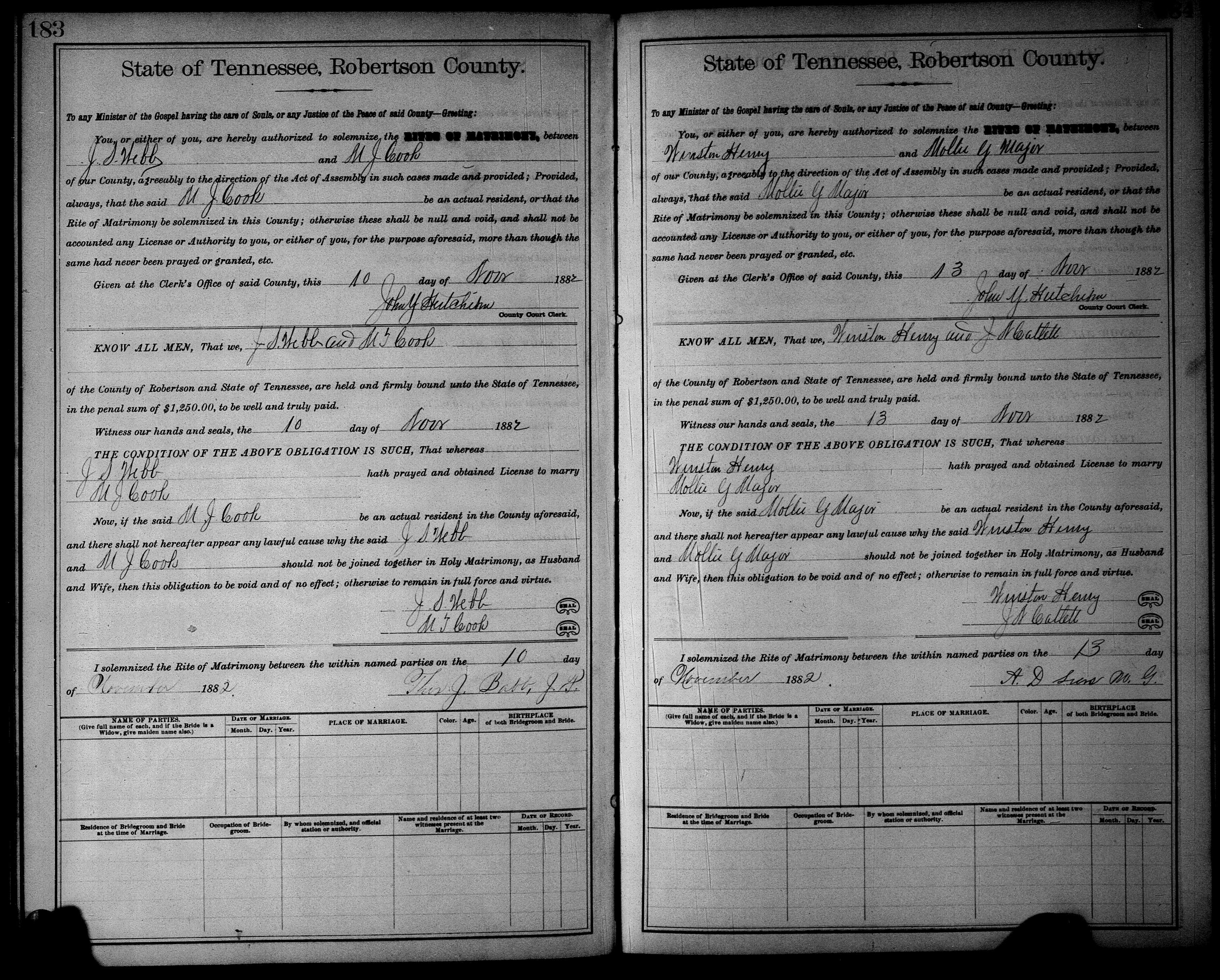 68. J S Webb and M J Cook, “Tennessee Marriages, 1796-1950,” November 12, 1882 (license registered November 10, 1882), Robertson County, TN, USA, system origin: Tennessee-ODM-source film number: 425213, https://familysearch.org/ark:/61903/1:1:QK41-YXQP, https://familysearch.org/ark:/61903/1:1:QKHM-8547.