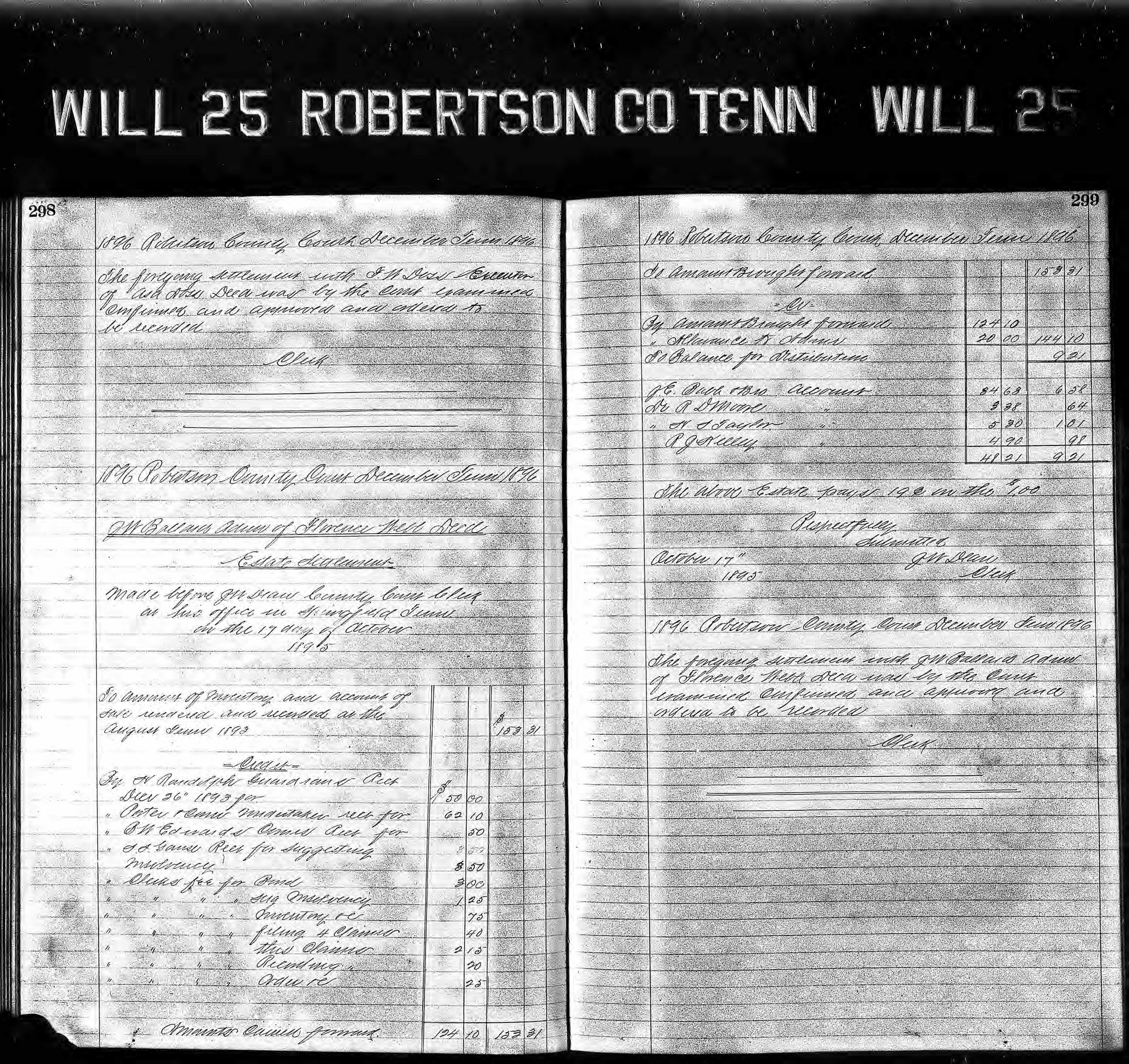 Made before J W Dean County Court Clerk at his office in Springfield Tenn on the 17 day of October 1895
