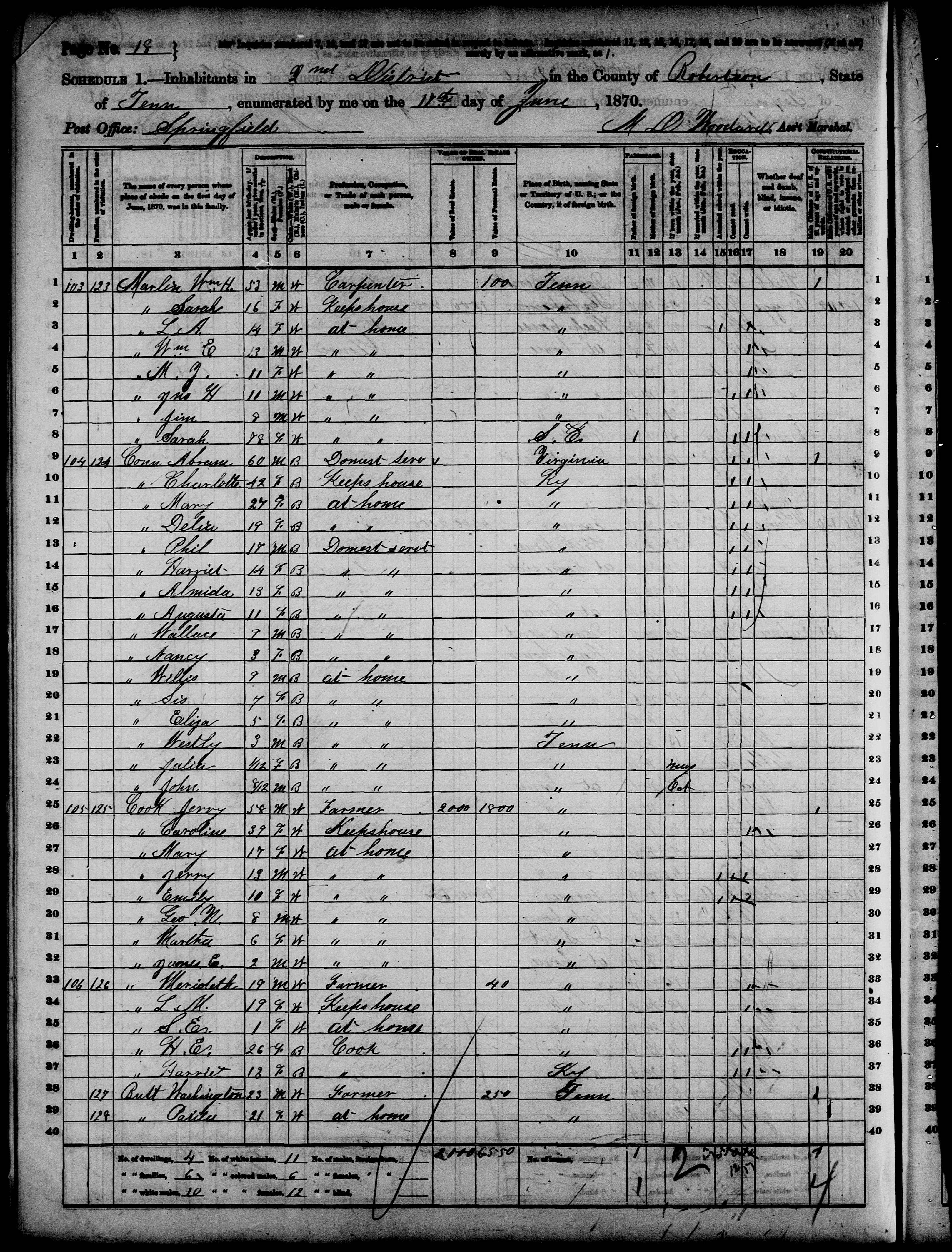 83. “United States Census,” 1870, TN, Robertson, Springfield, District 02, 18, M593, 553055, 18, Bureau of the Census, US Dept. of Commerce, United States of America, June 11, 1870, M D Woodard.