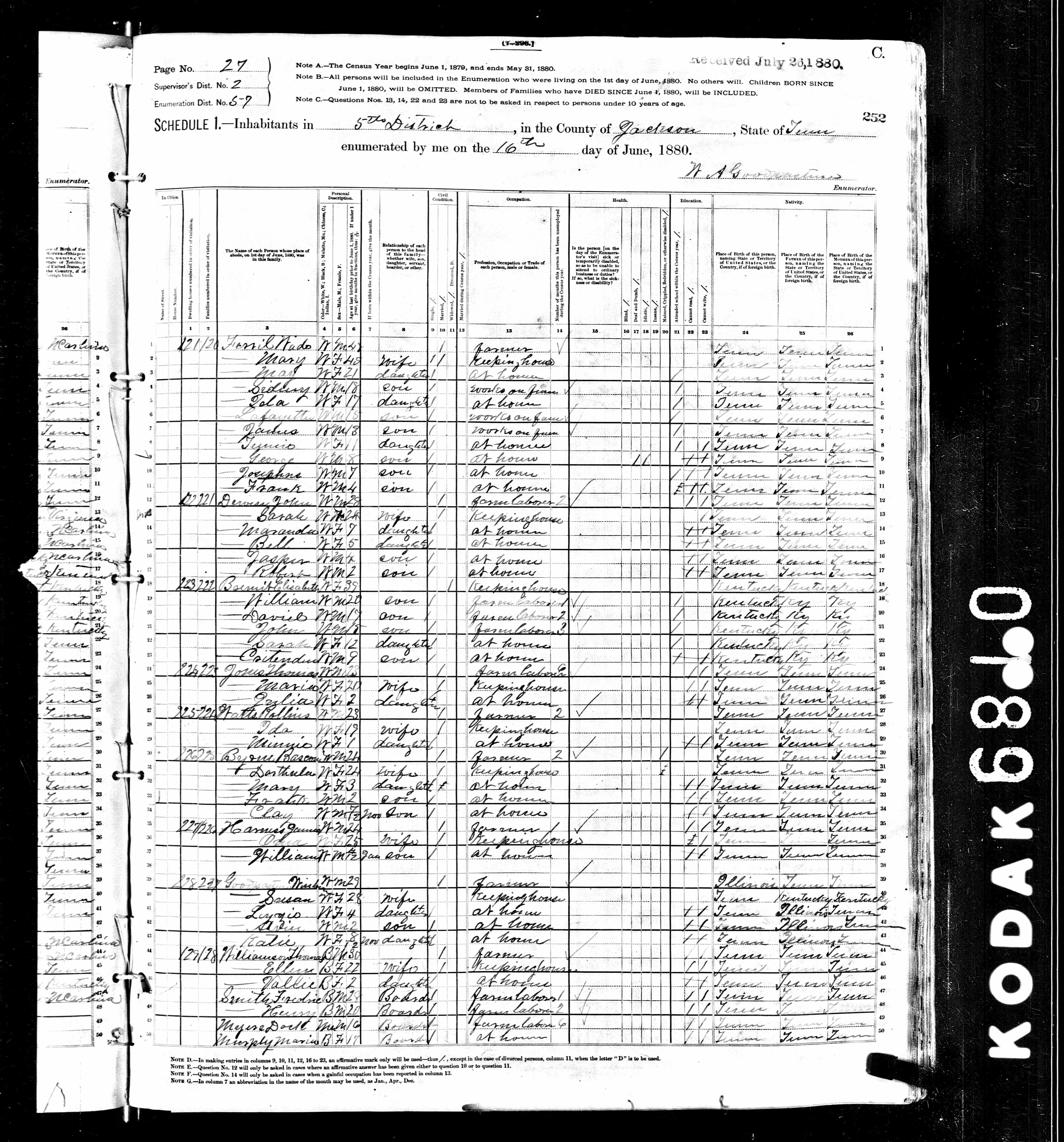 84. “Population Schedules for the 1880 Census,” 10th Decennial Census Office, Bureau of the Census, US Dept. of Commerce, United States of America, 1880, TN, Robertson County, District 02, June 25, 1880, D.W.C. Randolph, 19A, 3, 179.