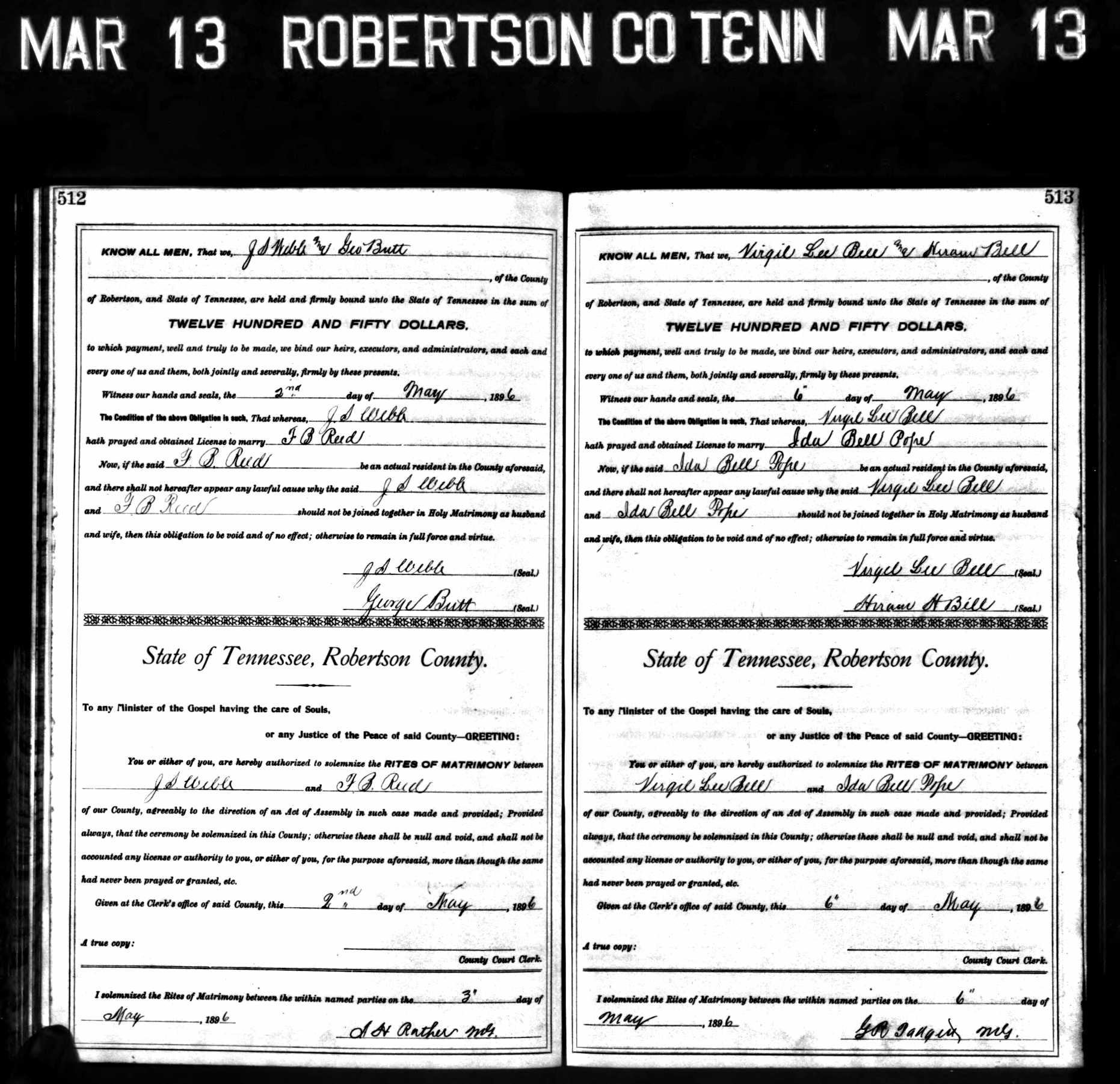 77. “Tennessee, State Marriage Index, 1780-2002,” J S Webb and F B Reed, May 3, 1896, Robertson County, TN, USA, https://familysearch.org/pal:/MM9.1.1/XD9M-R4V.
