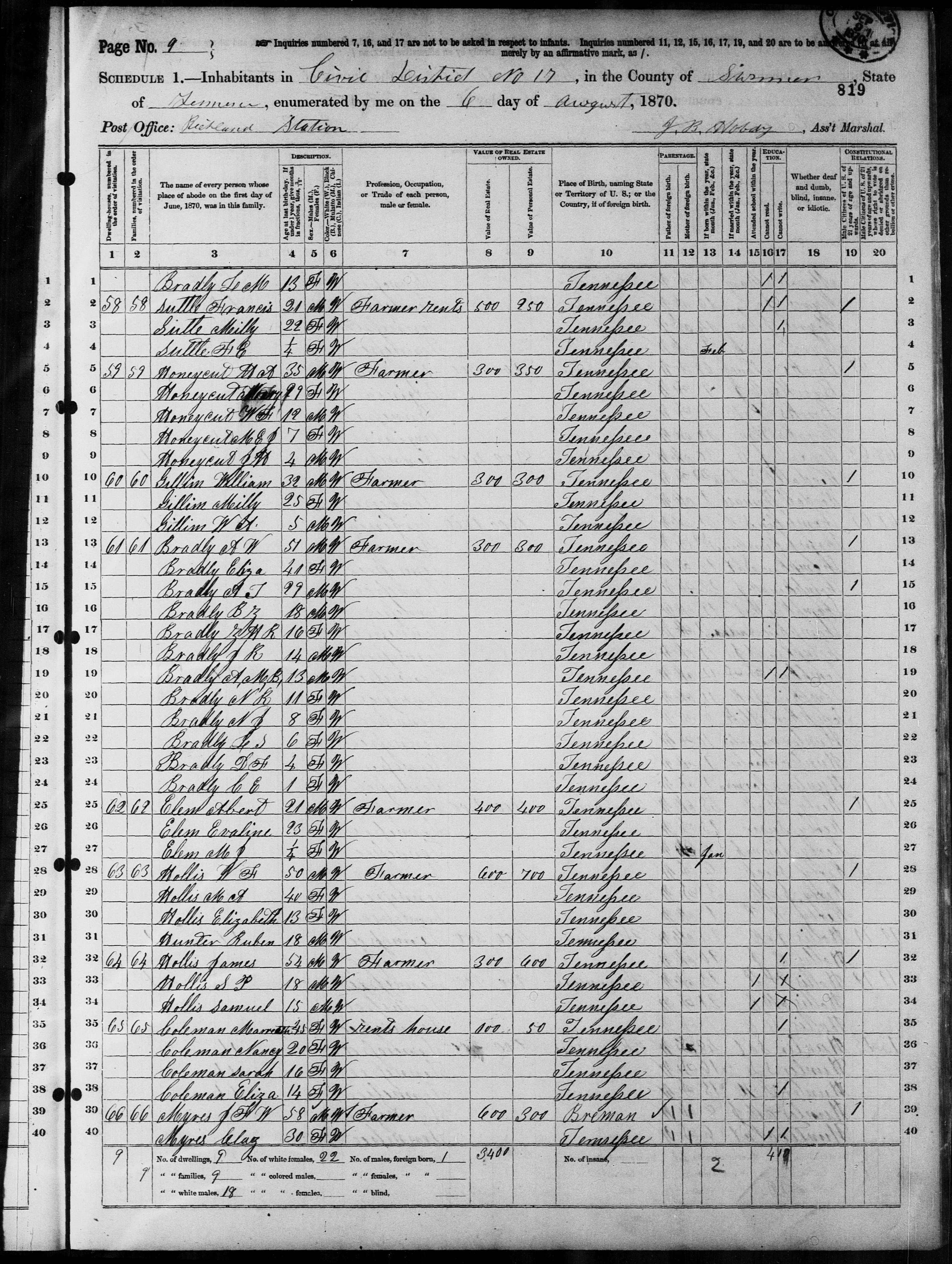 217. “United States Census,” 1870, TN, Sumner, District 17, Richland Station, 9, M593, 553065, 819, 538, Bureau of the Census, US Dept. of Commerce, United States of Americ, August 6, 1870, J B Hobdy.