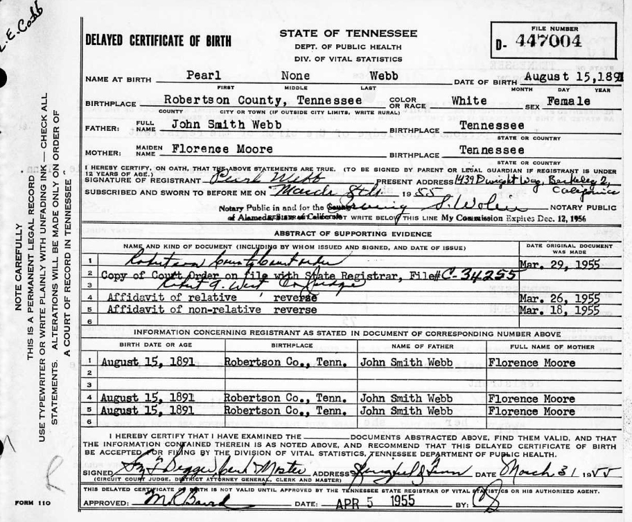 356. Pearl Webb, “Tennessee, Delayed Birth Records, 1869-1909,” August 15, 1891, Robertson County, TN, 447004, Lists name as Pearl (none) Webb.