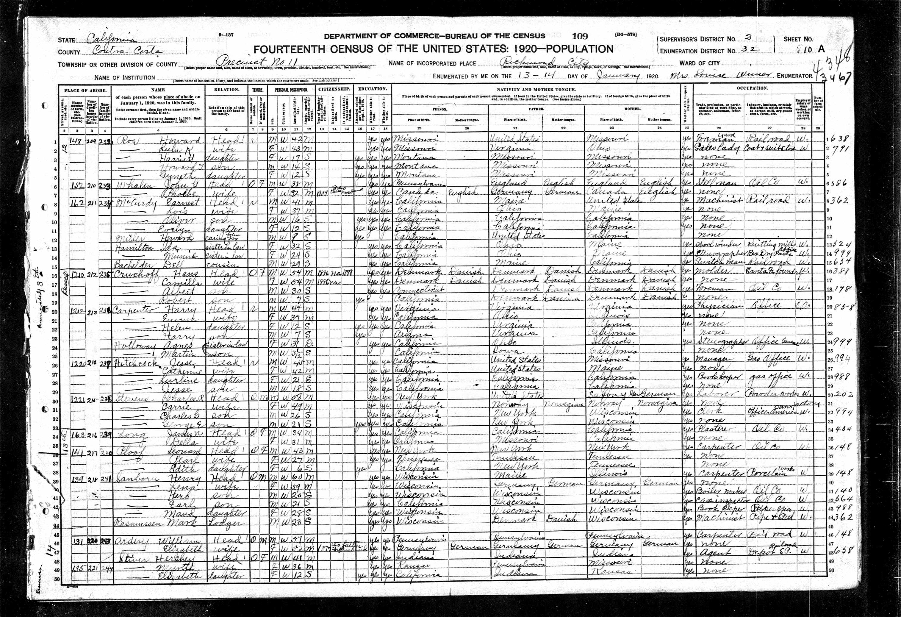 360. “United States Census: 1920,” Bureau of the Census, US Dept. of Commerce, United States of America, 1920, CA, Contra Costa, Richmond, January 13-14, 1920, Mrs. Louise WinnerCA M, 10A, 3, 32, T625, 95, 10A, 821.