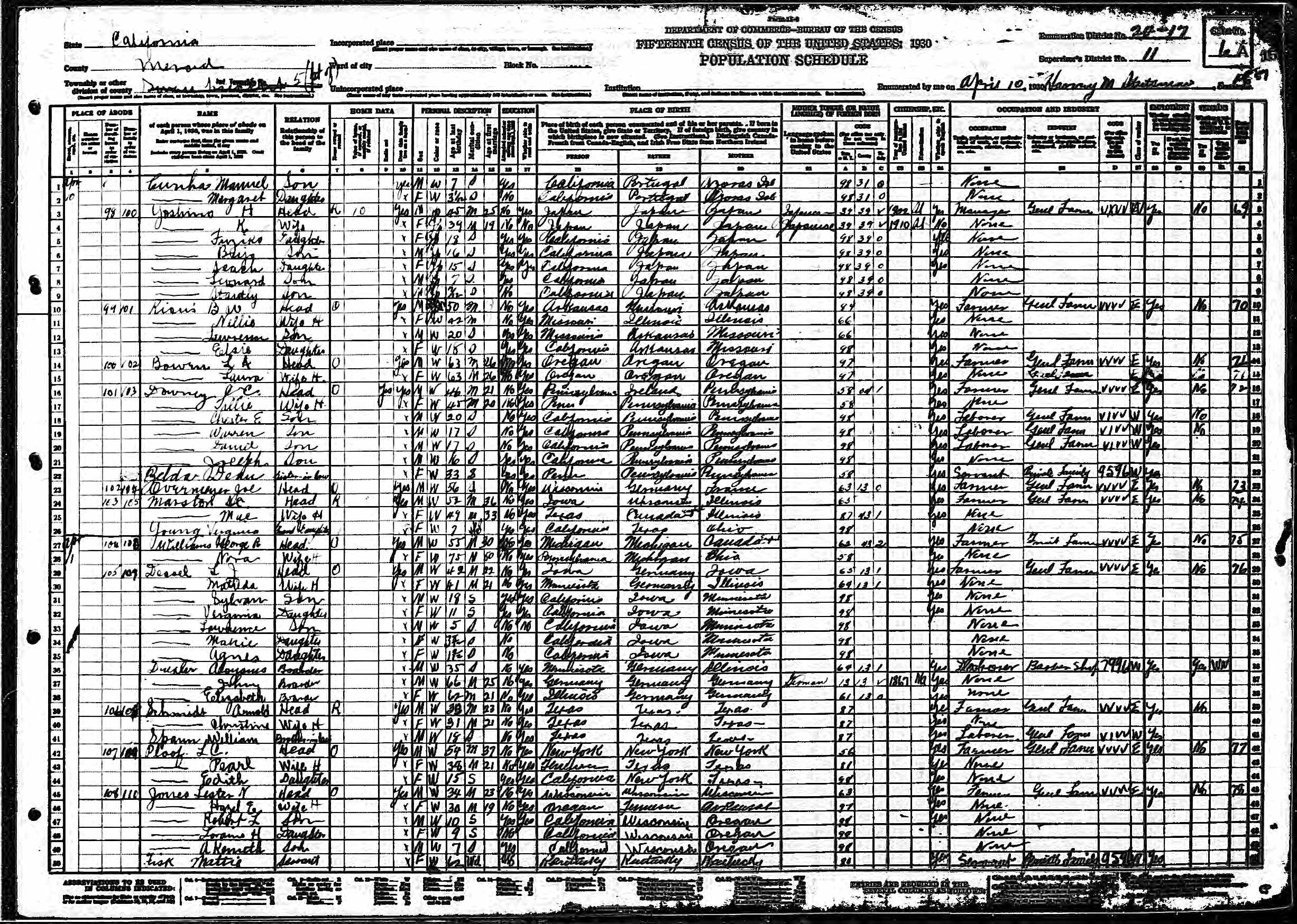 361. “United States Census: 1930,” Bureau of the Census, US Dept. of Commerce, United States of America, 1930, CA, Merced, Township 5 (Lincoln and Swan Pct), District 17, April 10, 1930, Harvey M Stutsman, 6A, 11, 24-17, T626, 178, 15, 11.
