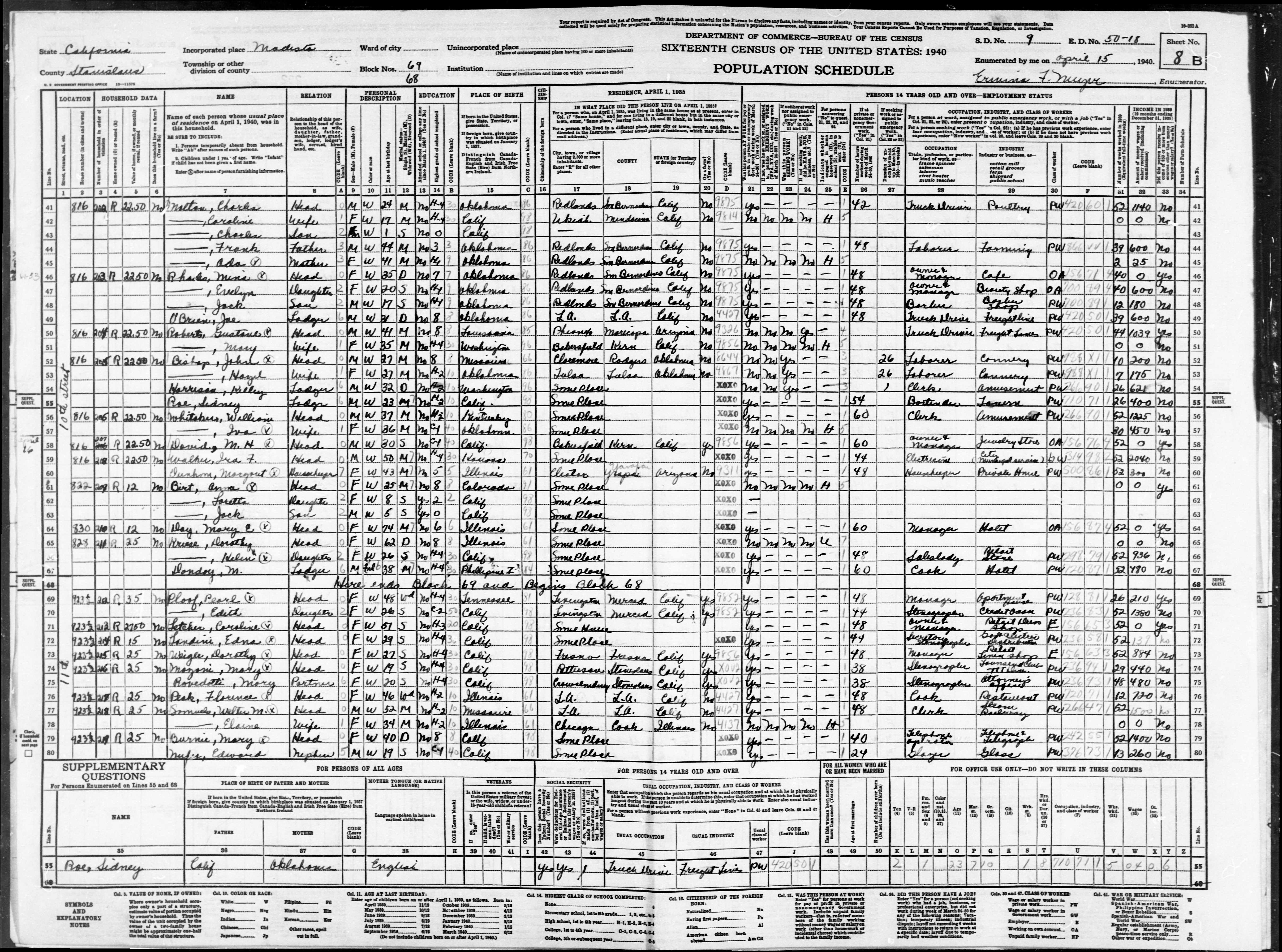 362. “United States Census: 1940,” US Census Bureau, US Dept. of Commerce, United States of America, 1940, CA, Stanislaus, Modesto, April 15, 1940, Ernusia F Neuyer, 8B, 9, 50-18, T627, 351, 16.