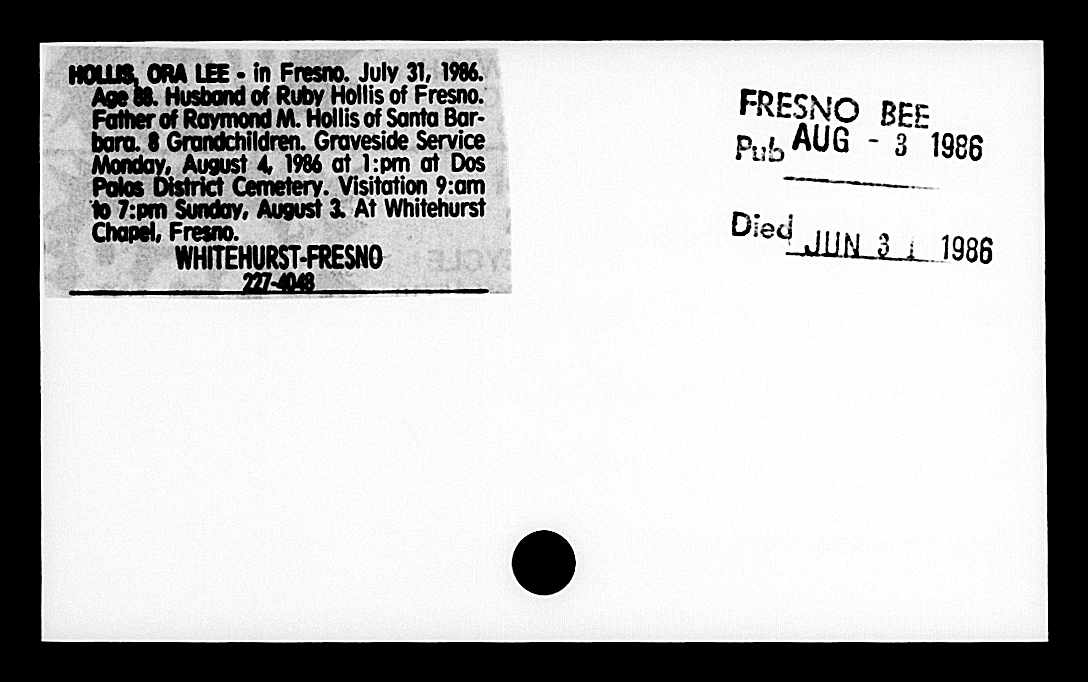 368. “Obituaries,” Ora Lee Hollis, Fresno Bee, Fresno, CA, August 3, 1986, https://familysearch.org/ark:/61903/1:1:Q2SV-2CSR.