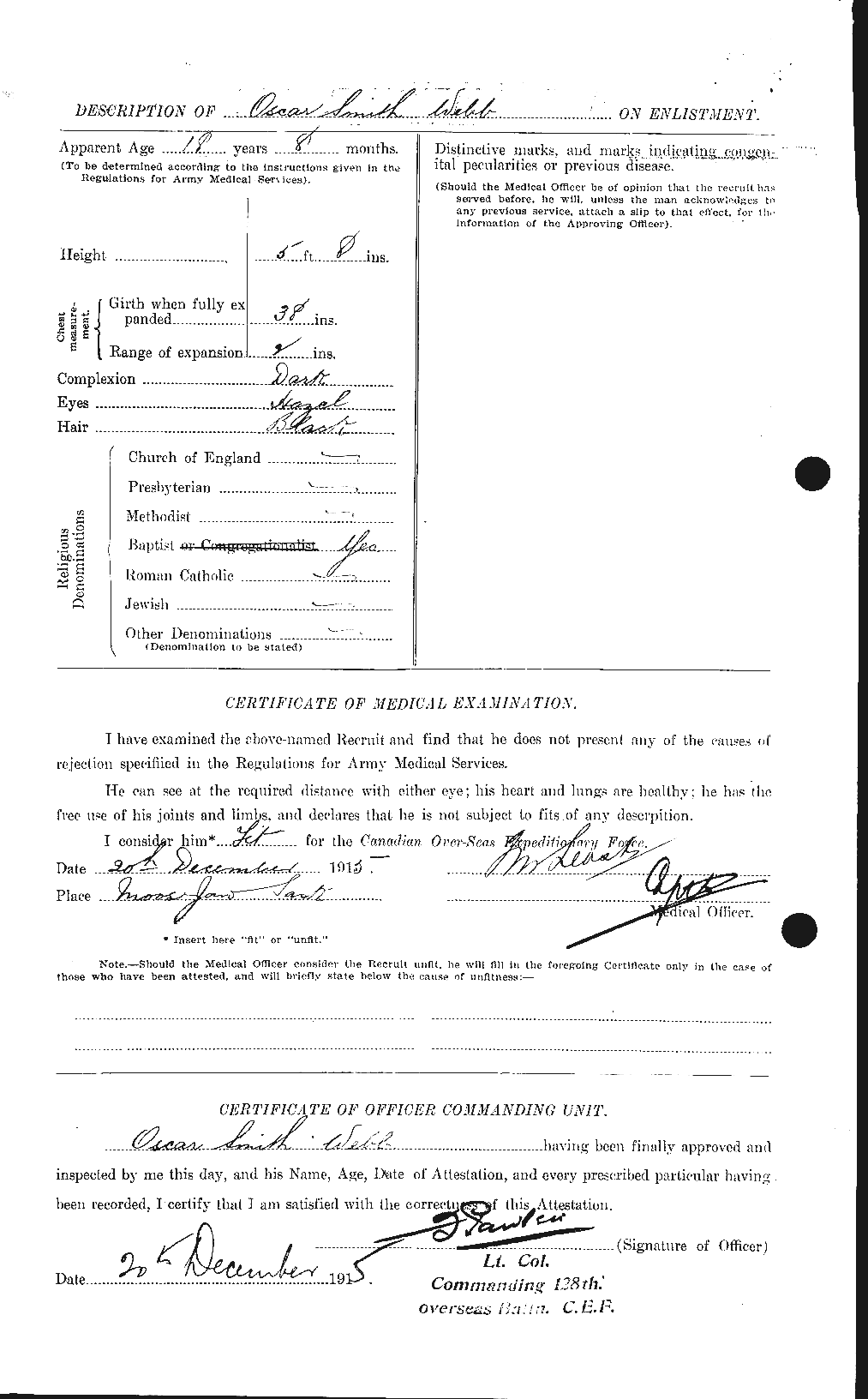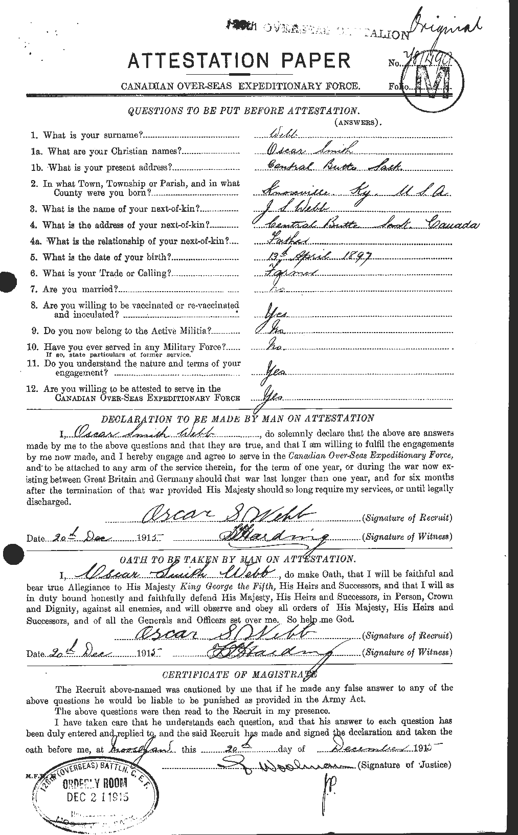 373. Oscar Smith Webb, “Soldiers of the First World War - Canadian Expeditionary Force,” December 20, 1915, Moose Jaw, SK, Canada, 781449, http://www.bac-lac.gc.ca/eng/discover/military-her...aspx?IdNumber=303237.