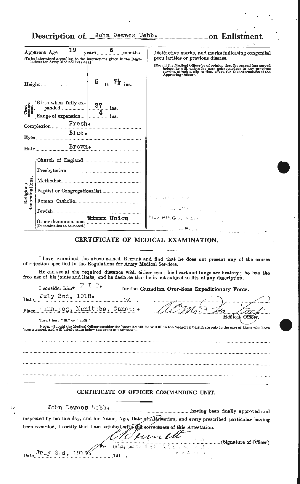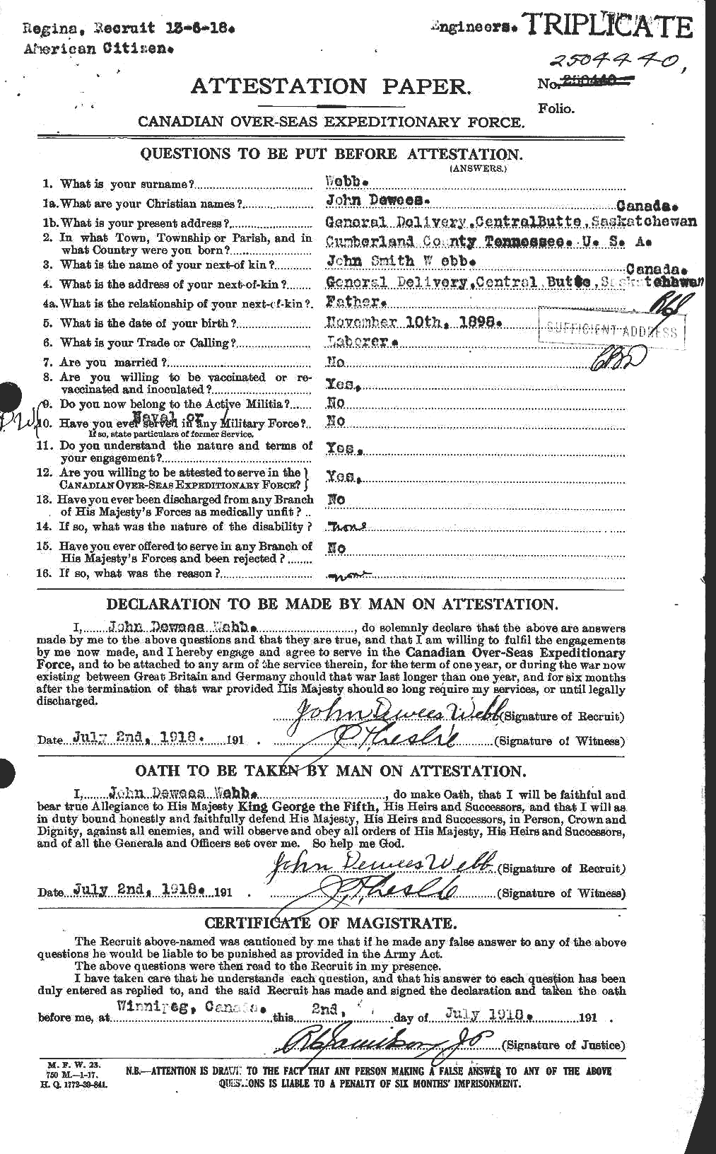 377. John Dewees Webb, “Soldiers of the FIrst Wolrd War - Canadian Expeditionary Force,” July 2, 1918, Winnipeg, MB, Canada, 2504440, http://www.bac-lac.gc.ca/eng/discover/military-her...aspx?IdNumber=303173, Lists birth in Cumberland County, TN, USA.