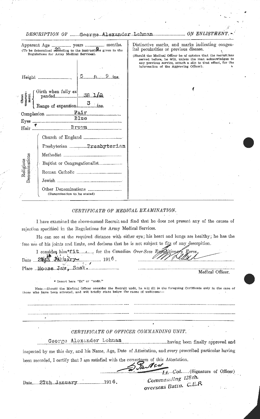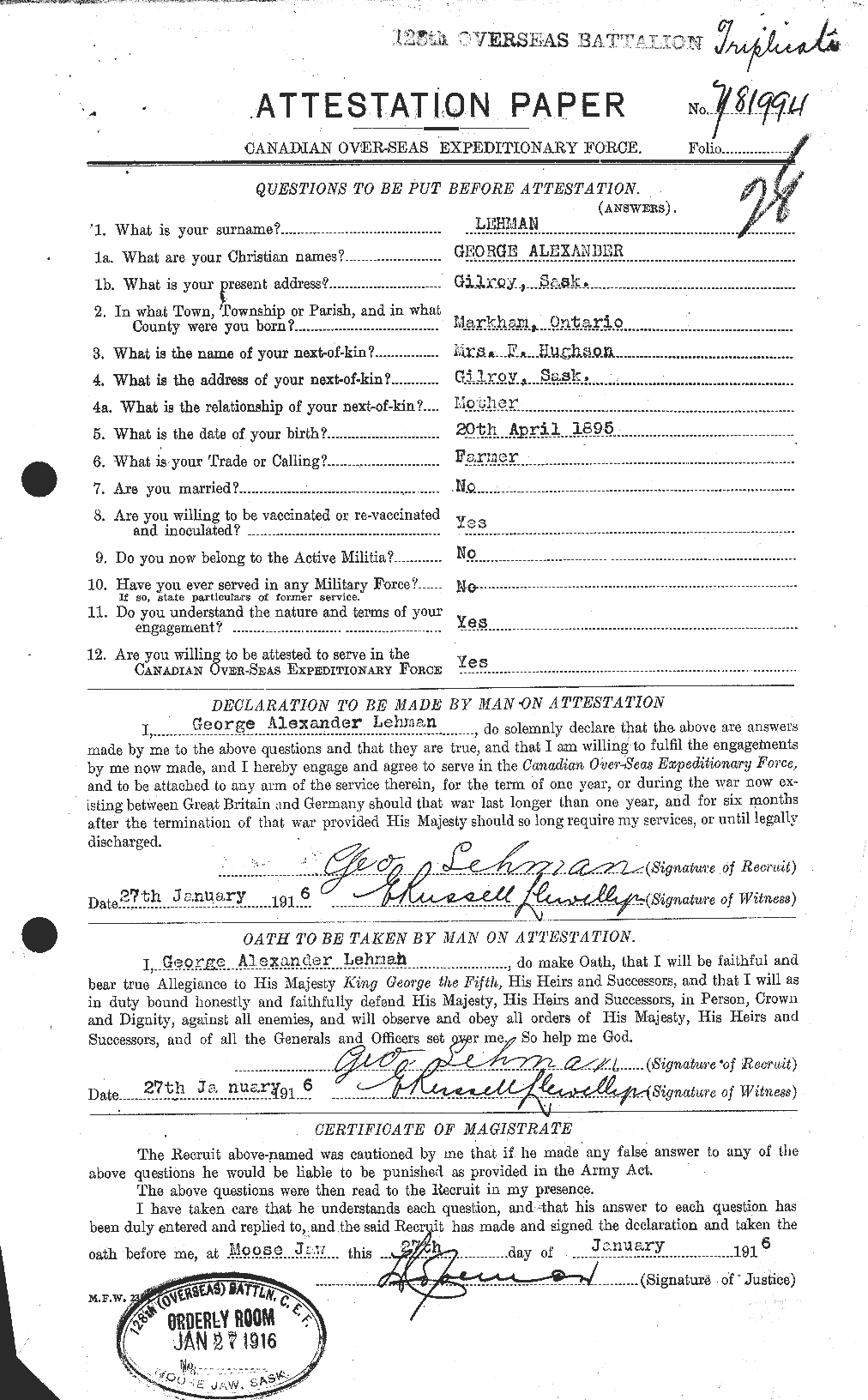 393. George Alexander Lehman, “Soldiers of the First World War - Canadian Expeditionary Force,” January 27, 1916, Moose Jaw, SK, 781994, http://www.bac-lac.gc.ca/eng/discover/military-her...aspx?IdNumber=525704, Lists birth in Markham, ON.