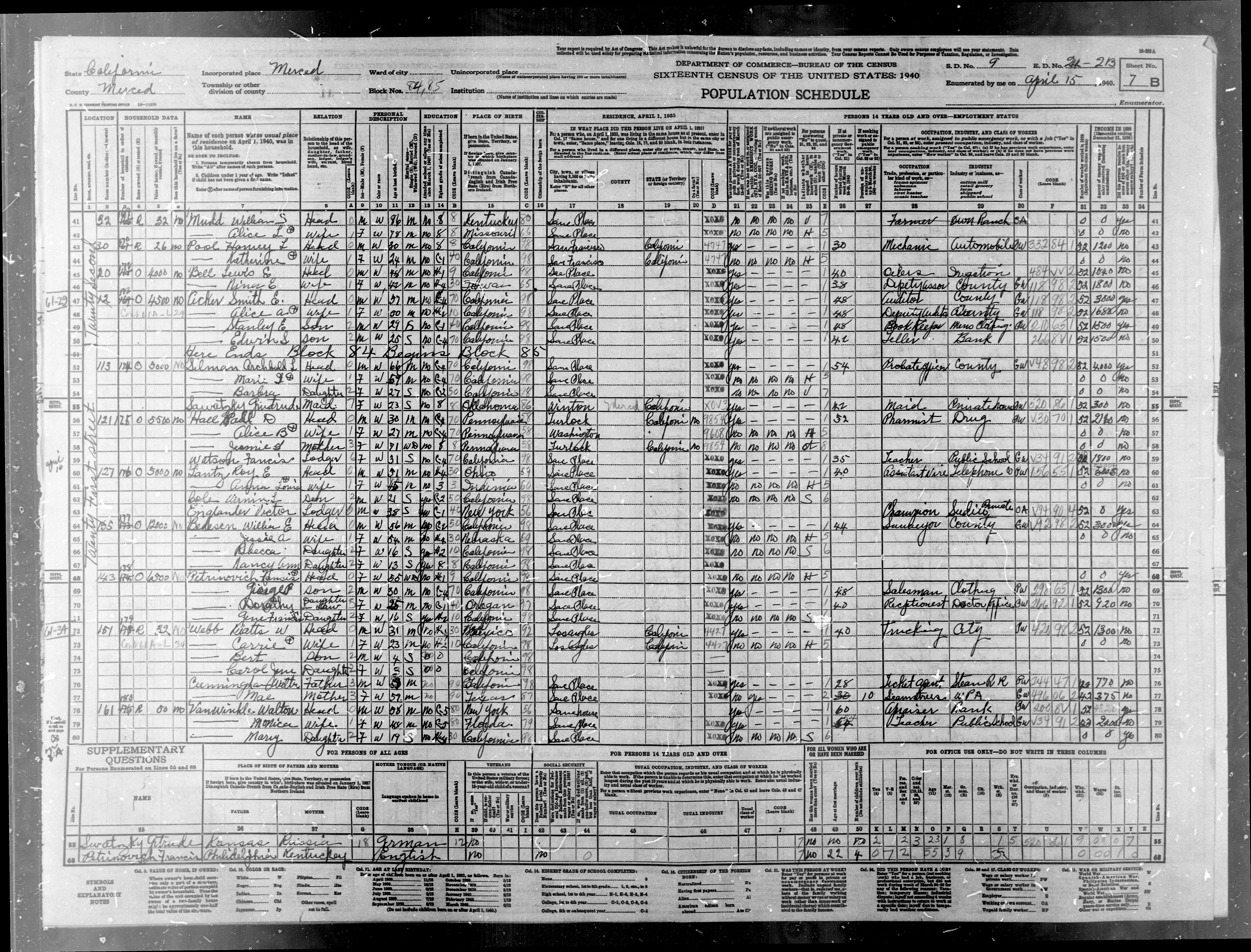 407. “United States Census,” 1940, CA, Merced, Merced, Judicial Township 2, 7B, 9, 24-2B, T627, 264, 88, US Census Bureau, US Dept. of Commerce, United States of America, April 15, 1940.