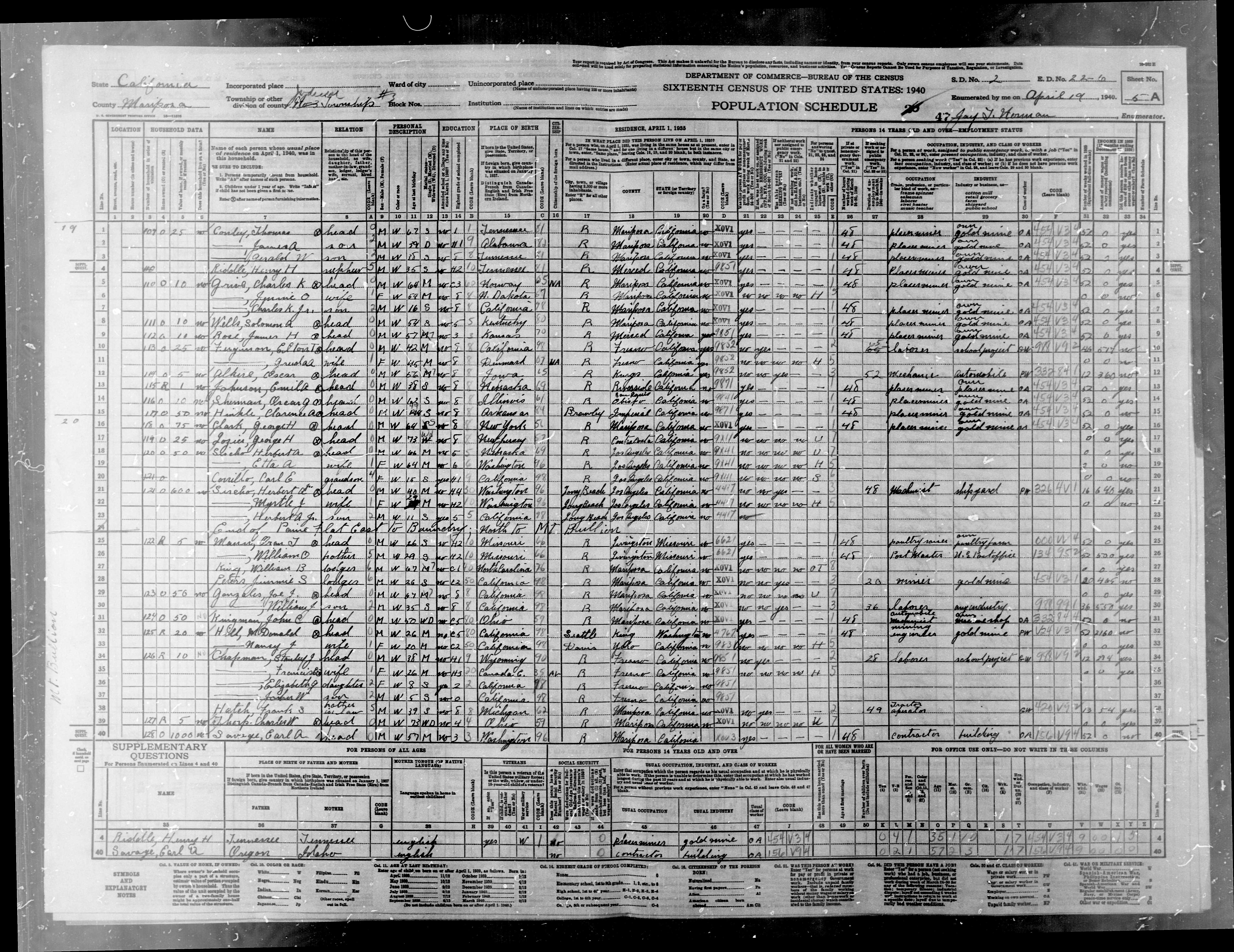 413. “United States Census: 1940,” Bureau of the Census, US Dept. of Commerce, United States of America, 1940, CA, Mariposa, Judicial Township 3, Bear Valley, Mount Bullion, April 19, 1940, Jay T Aornson, 5A, 2, 22-6, T627, 262, 883.
