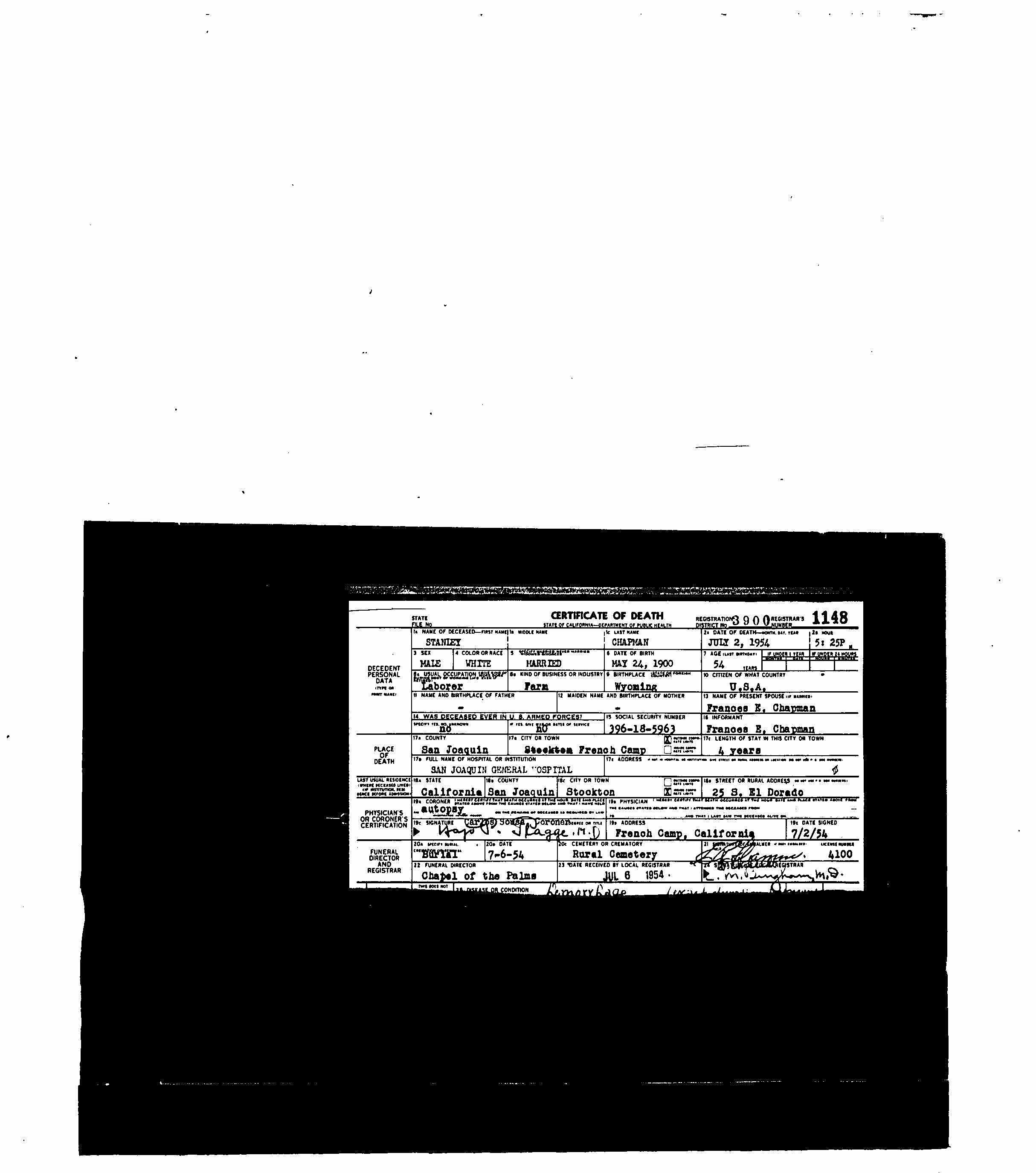 422. Stanley Chapman, “California, County Birth and Death Records, 1800-1994,” July 2, 1954, Stockton, San Joaquin County, CA, https://familysearch.org/ark:/61903/1:1:QV37-8NN4.