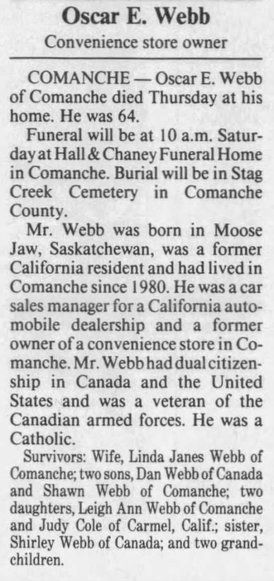 Mr. Webb was born in Moose Jaw, Saskatchewan, was a former California resident and had lived in Comanche since 1980. He was a car sales manager for a California automobile dealership and a former owner of a convenience store in Comanche. Mr. Webb had dual citizenship in Canada and the United States and was a veteran of the Canadian armed forces. He was a Catholic.