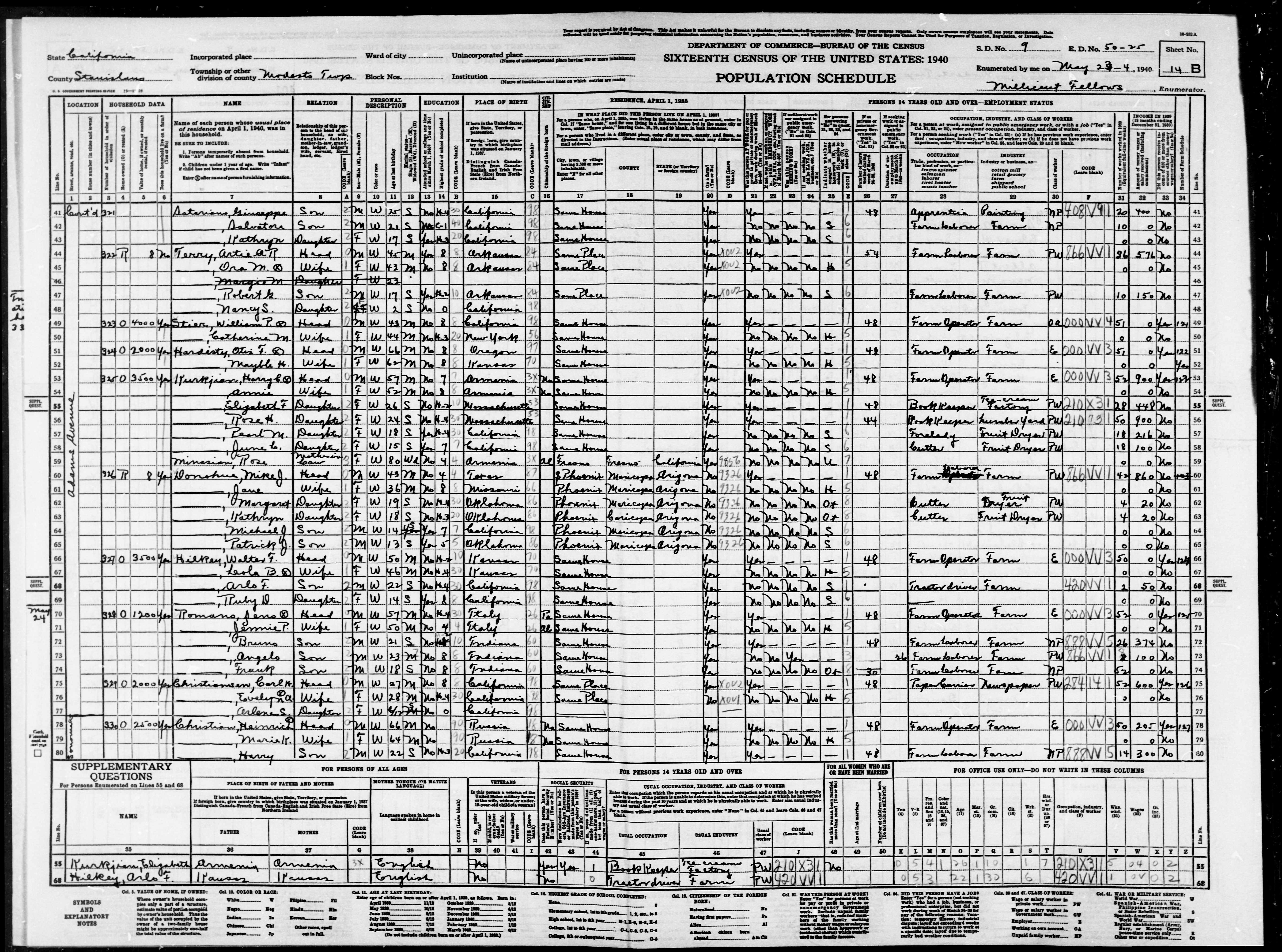 802. “United States Census: 1940,” Bureau of the Census, US Dept. of Commerce, United States of America, 1940, CA, Stanislaus, Modesto, May 24, 1940, Millicent Fellows, 14B, 9, 50-25, T627, 352, 32.