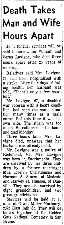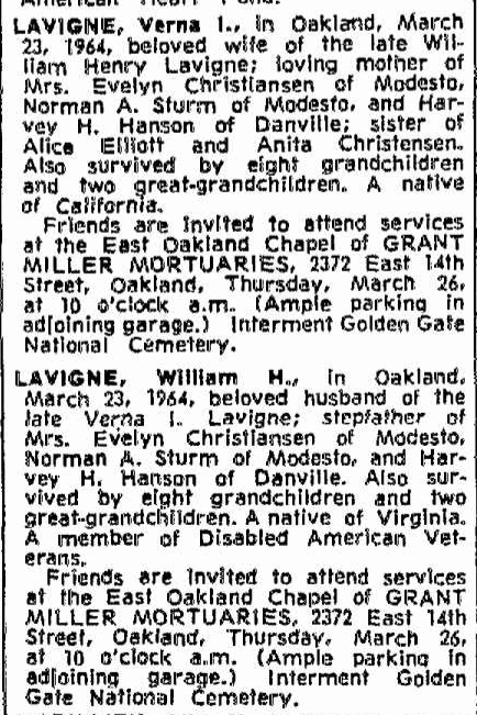 Files (2): WilliamLavigneDeathOakTrib_Mar25_1964, VernaHotchkissHansonLavigneObitOakTrib_Mar25_1964