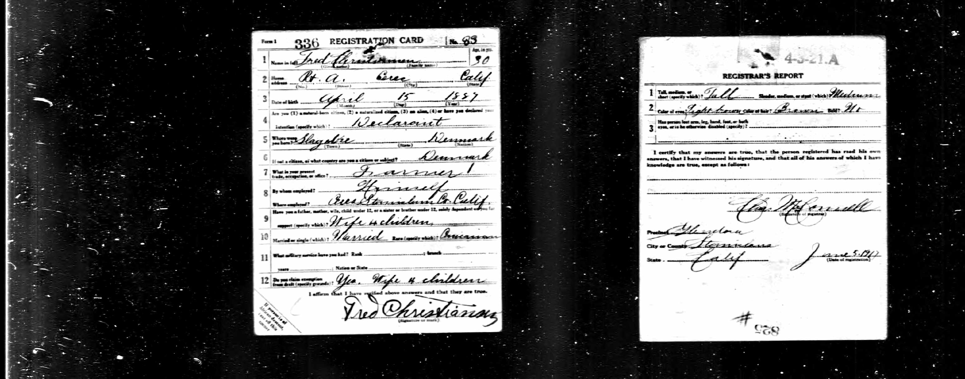 840. World War I, 1917, California, 336, Christiansen, Fred, “World War I Selective Service System Draft Registration Cards,” June 5, 1917, Stanislaus County, CA, USA, nara publication number: M1509-film number: 1544412-digital folder number: 005241103-image number: 01717, https://familysearch.org/pal:/MM9.1.1/KZK4-GHN, Lists birth place as Slagelse, Denmark.