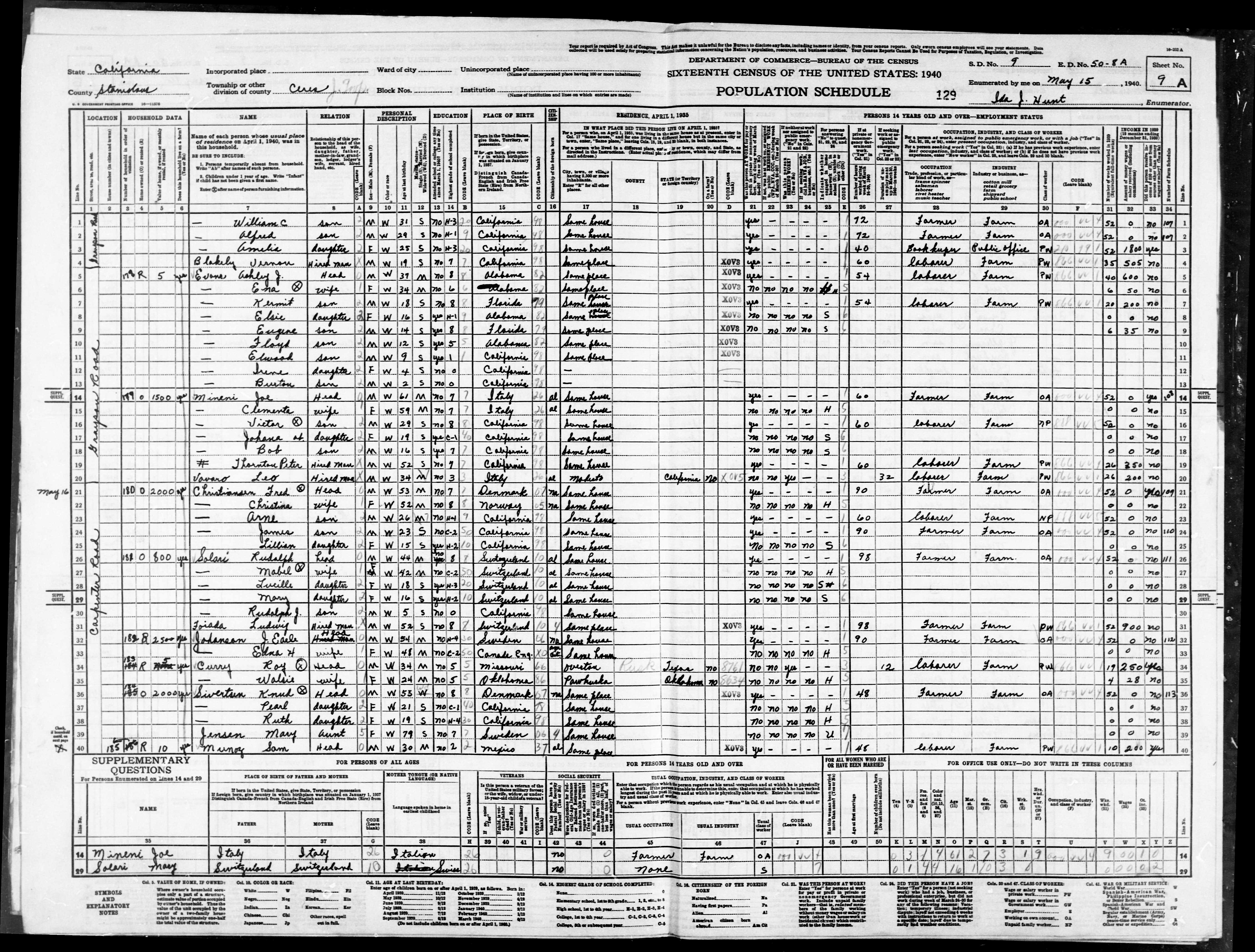 845. “United States Census: 1940,” Bureau of the Census, US Dept. of Commerce, United States of America, 1940, CA, Stanislaus, Ceres, May 15, 1940, Ida J Hunt, 9A, 9, 50-8A, T627, 351, 263.
